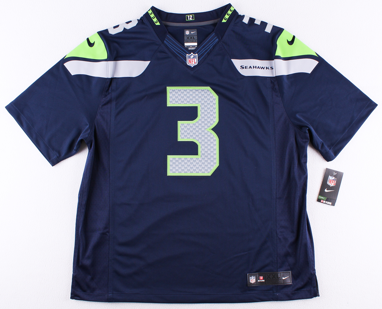 Nike jersey, size XXL. Jersey is new with tags. Hand-signed in black felt-tip pen by Russell Wilson.