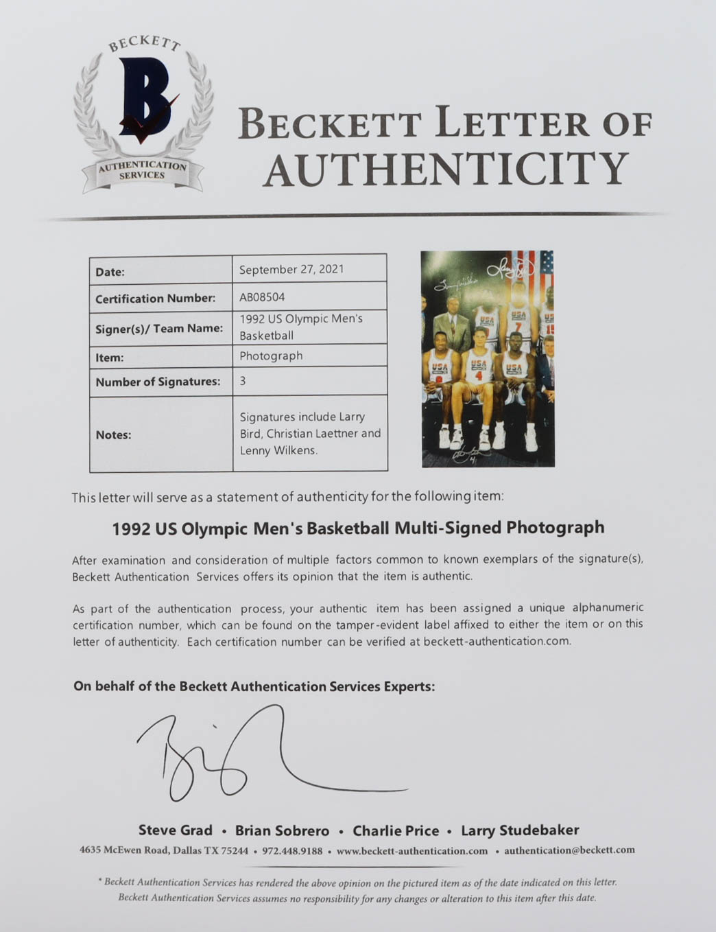 Team USA photo poster measures 24" x 36" in size and has been hand-signed by Larry Bird (Boston Celtics, HOF), Christian Laettner (Minnesota Timberwolves), Lenny Wilkens (Coach, HOF).