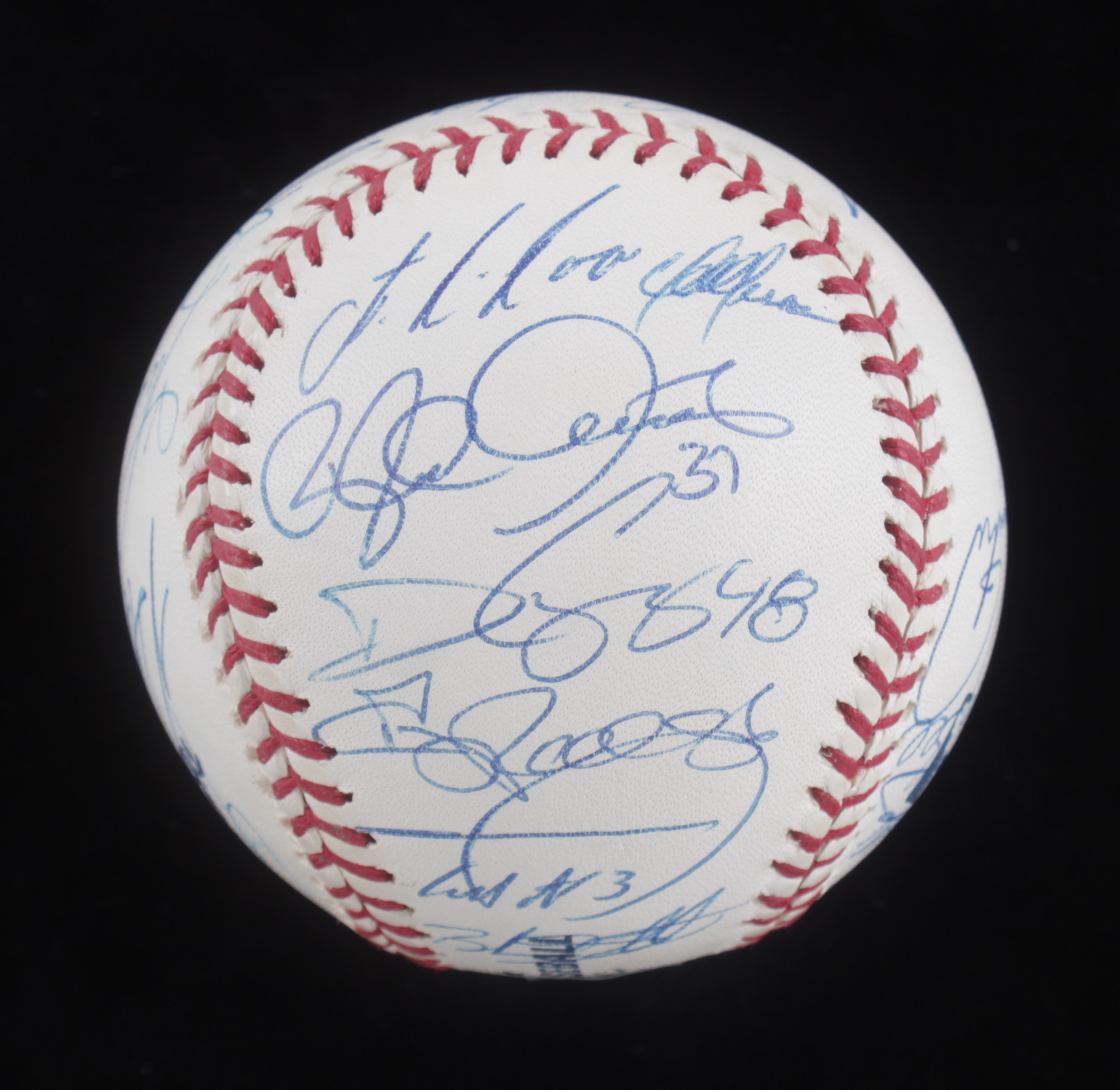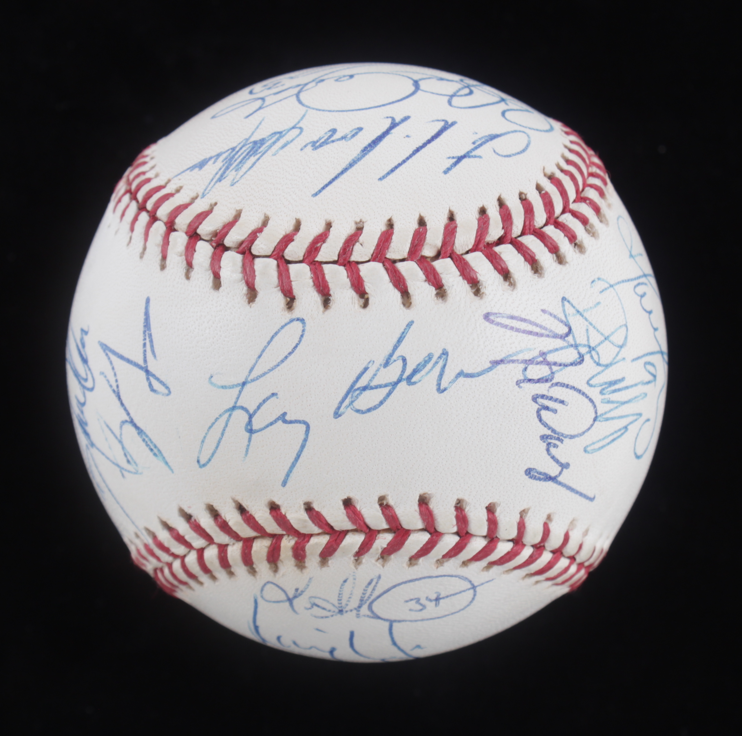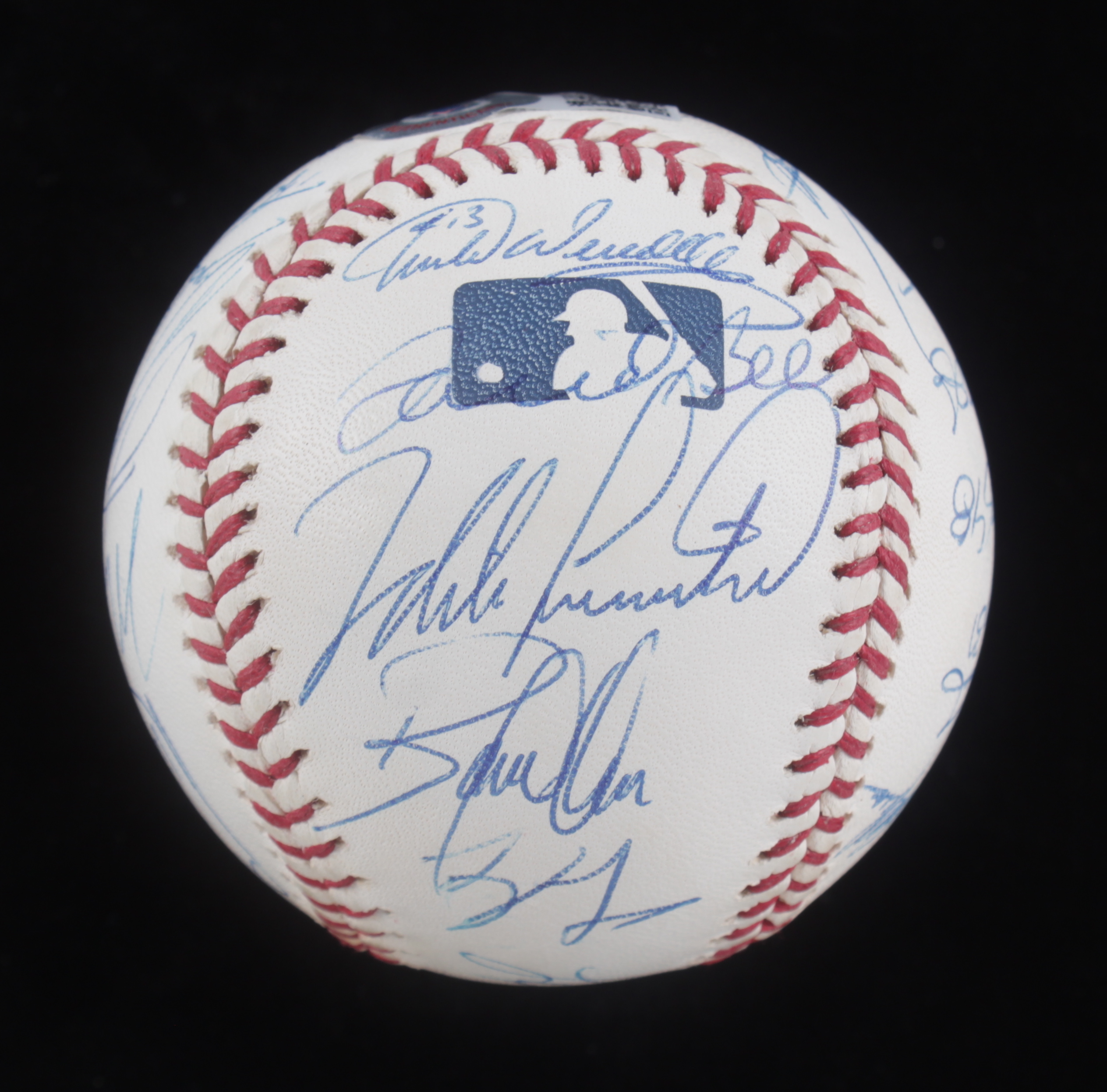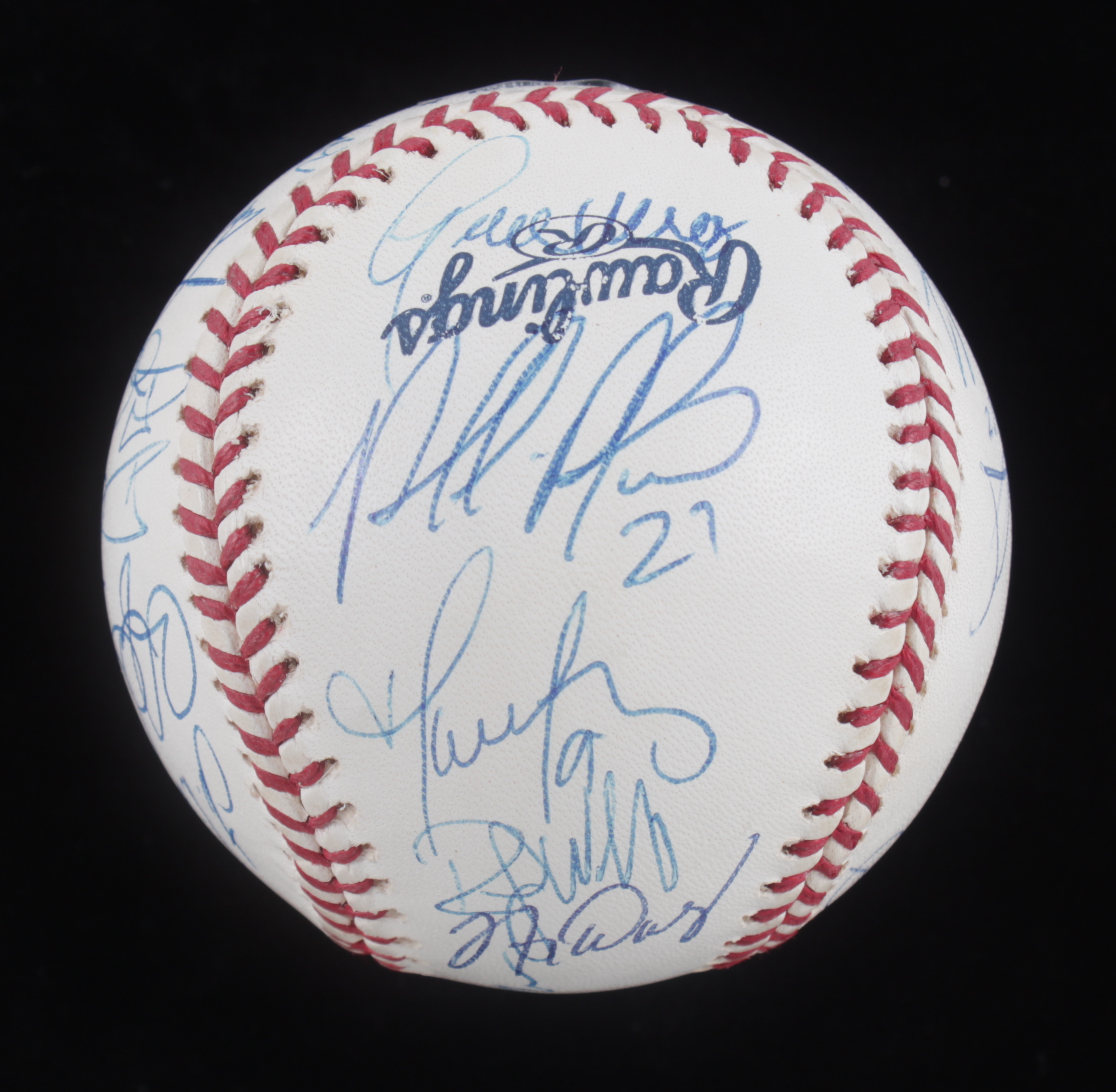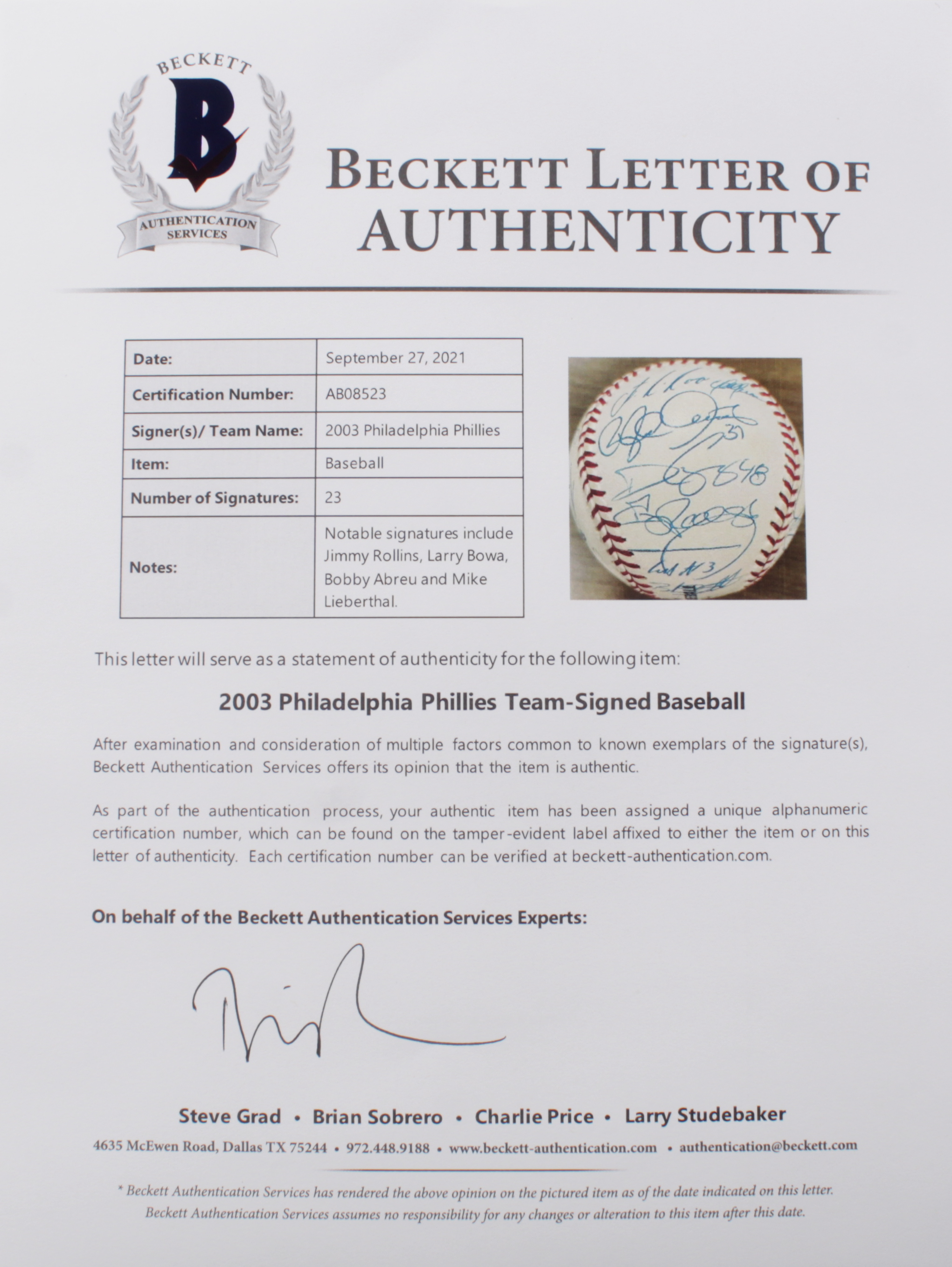 Rawlings Official Major League Baseball. Hand-signed by (23) of the 2003 Philadelphia Phillies including Larry Bowa, Jimmy Rollins, Bobby Abreu, Mike Lieberthal, Rheal Cormier, Jason Michaels, Turk Wendell, Jose Mesa, Greg Gross, Marlon Byrd, Kevin Millwood, Hector Mercado, Brandon Duckworth, Dan Plesac, Randy Wolfe, Pat Burrell, Ramon Henderson, Tony Scott, David Bell, Placido Polanco and (3) others.