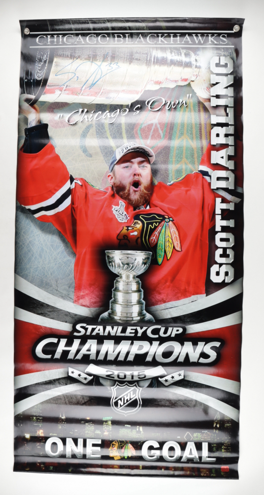 Banner measures 27" x 50" in size and has been hand-signed by Scott Darling (Chicago Blackhawks).