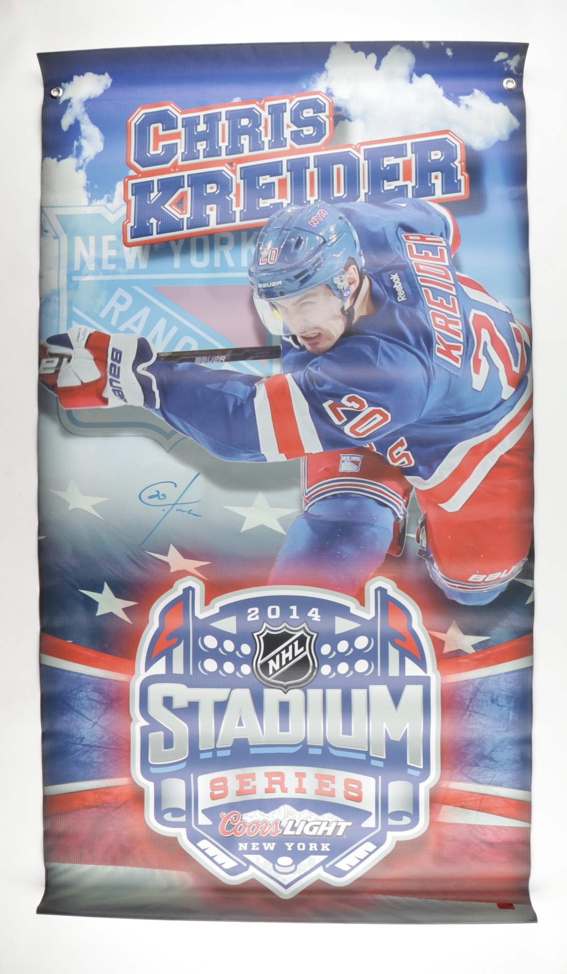Banner measures 27" x 45" in size and has been hand-signed by Chris Kreider (New York Rangers).