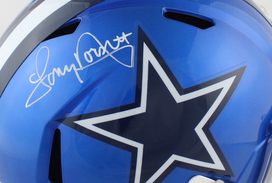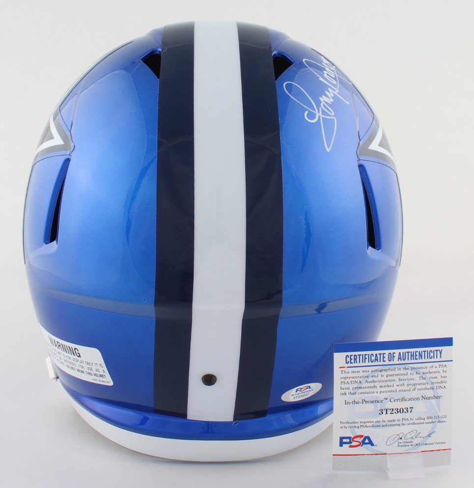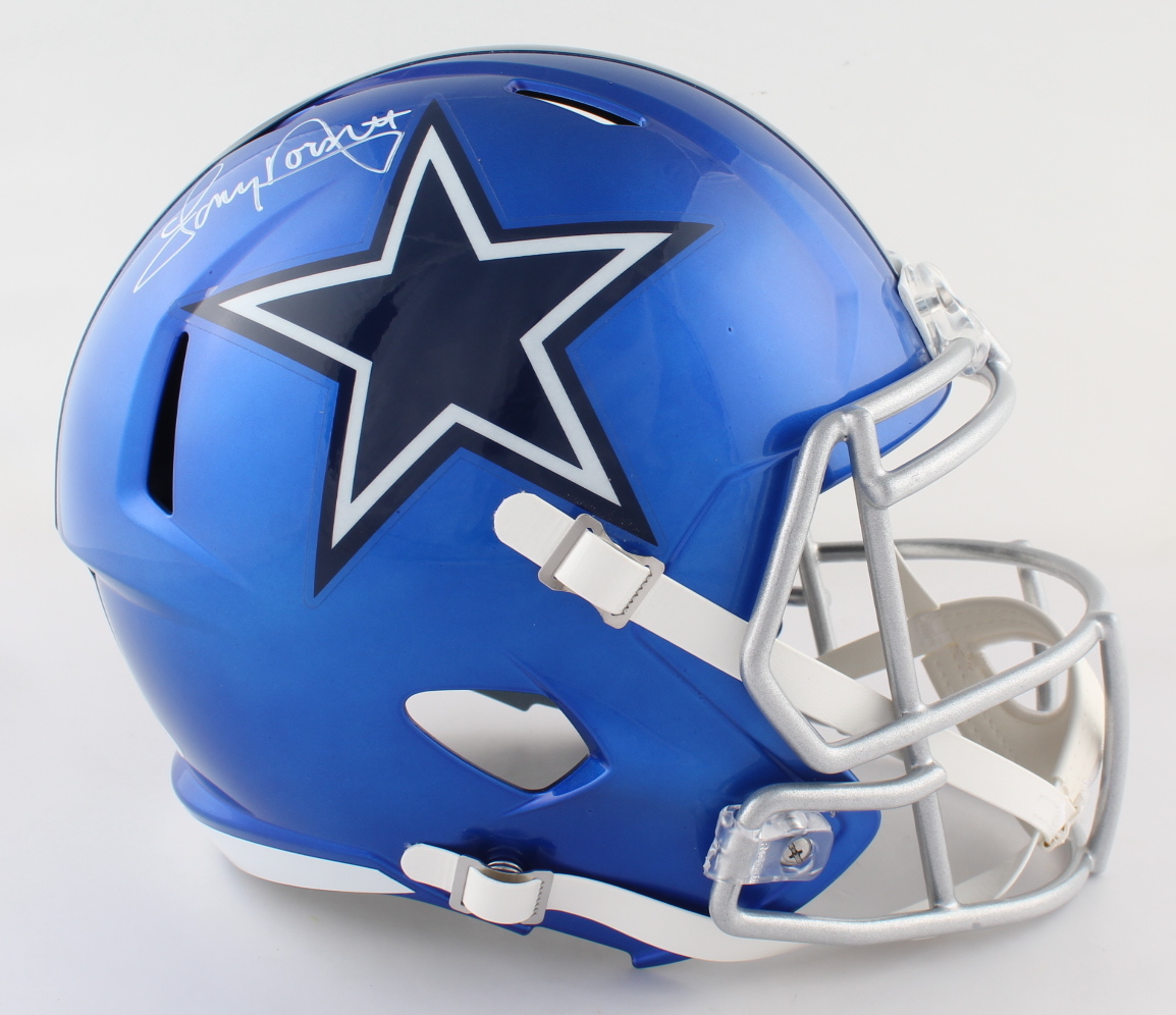 Riddell Dallas Cowboys full-size Flash Alternate Speed replica helmet. Hand-signed by Tony Dorsett (HOF). Please note, there is a small chip in the front of the helmet.