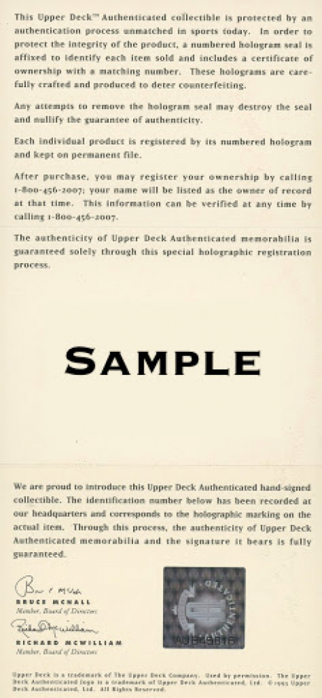 The lot / autograph(s) includes an official Upper Deck Authenticated (UDA) hologram and matching COA for authenticity purposes.