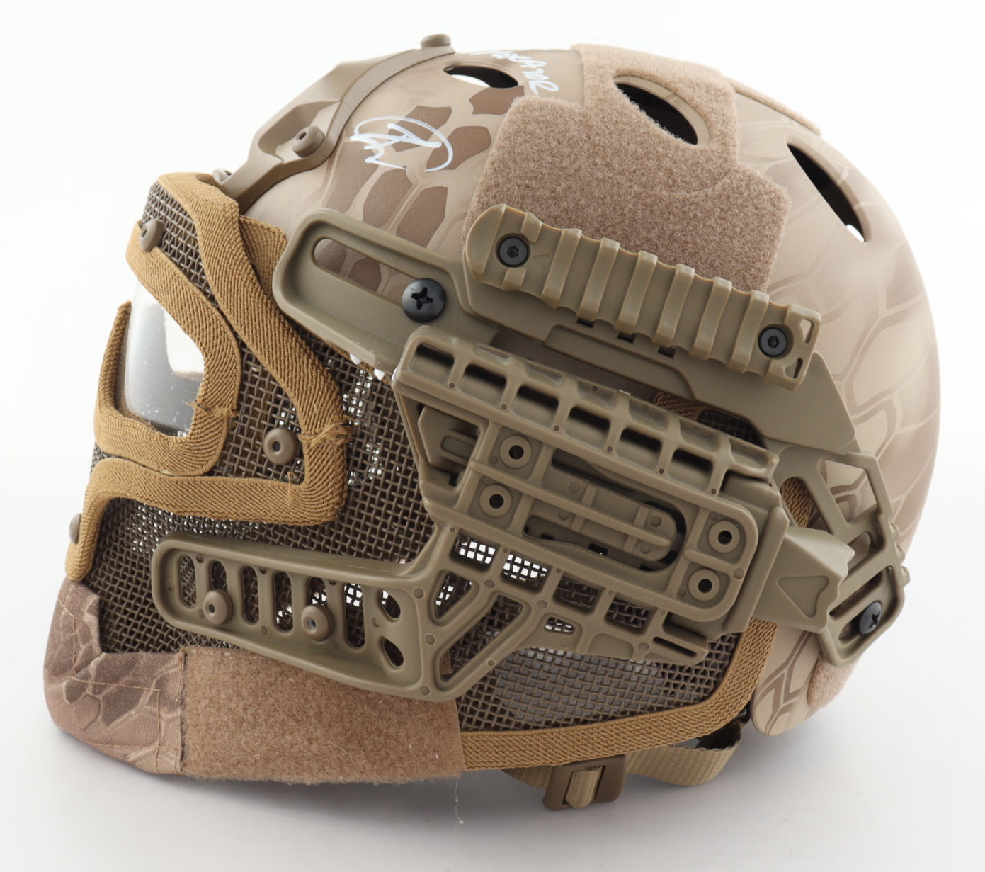 U.S. Navy SEAL tactical helmet has been hand signed by Robert O’Neill. Please note, the fabric is torn near the eyelids.