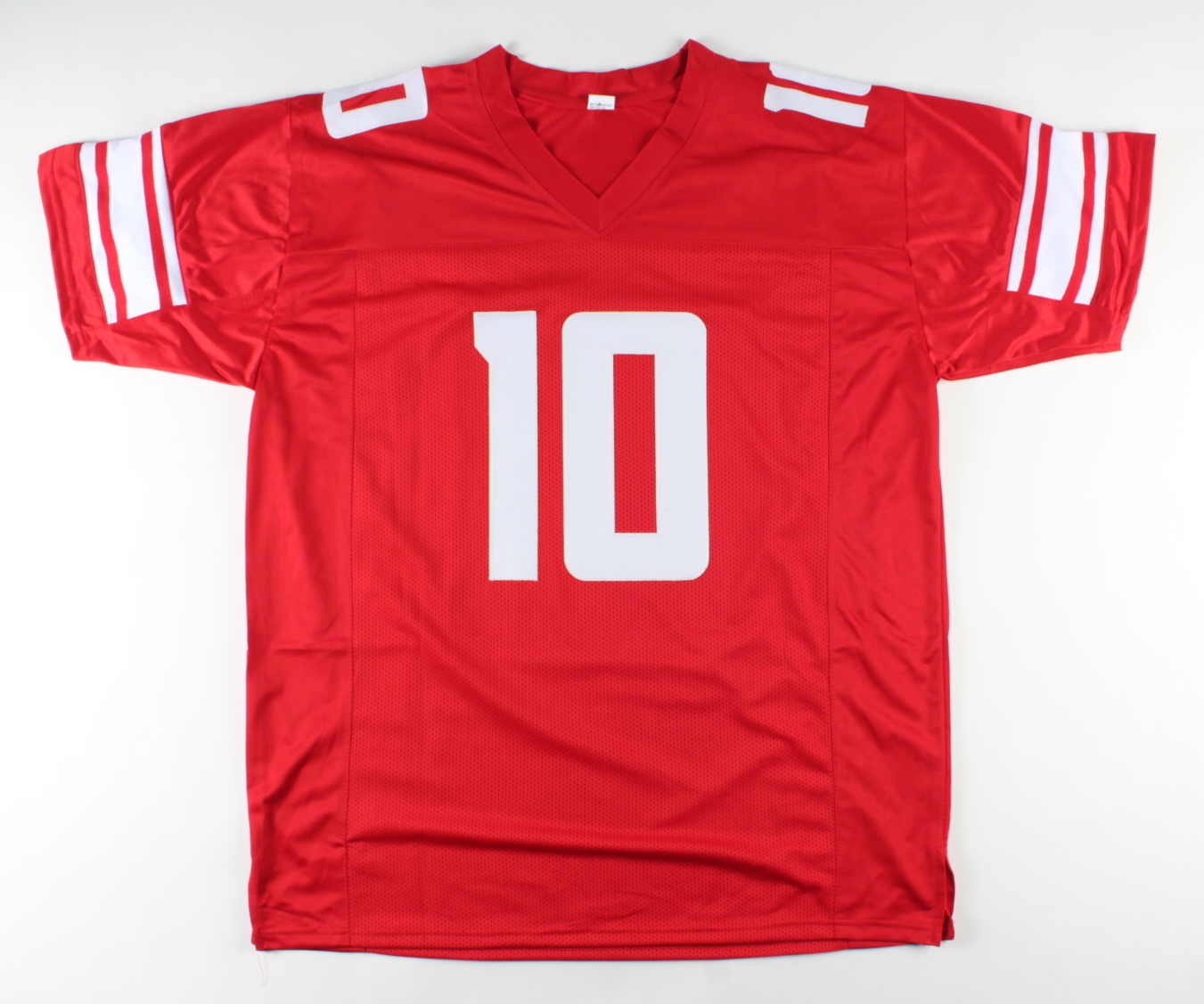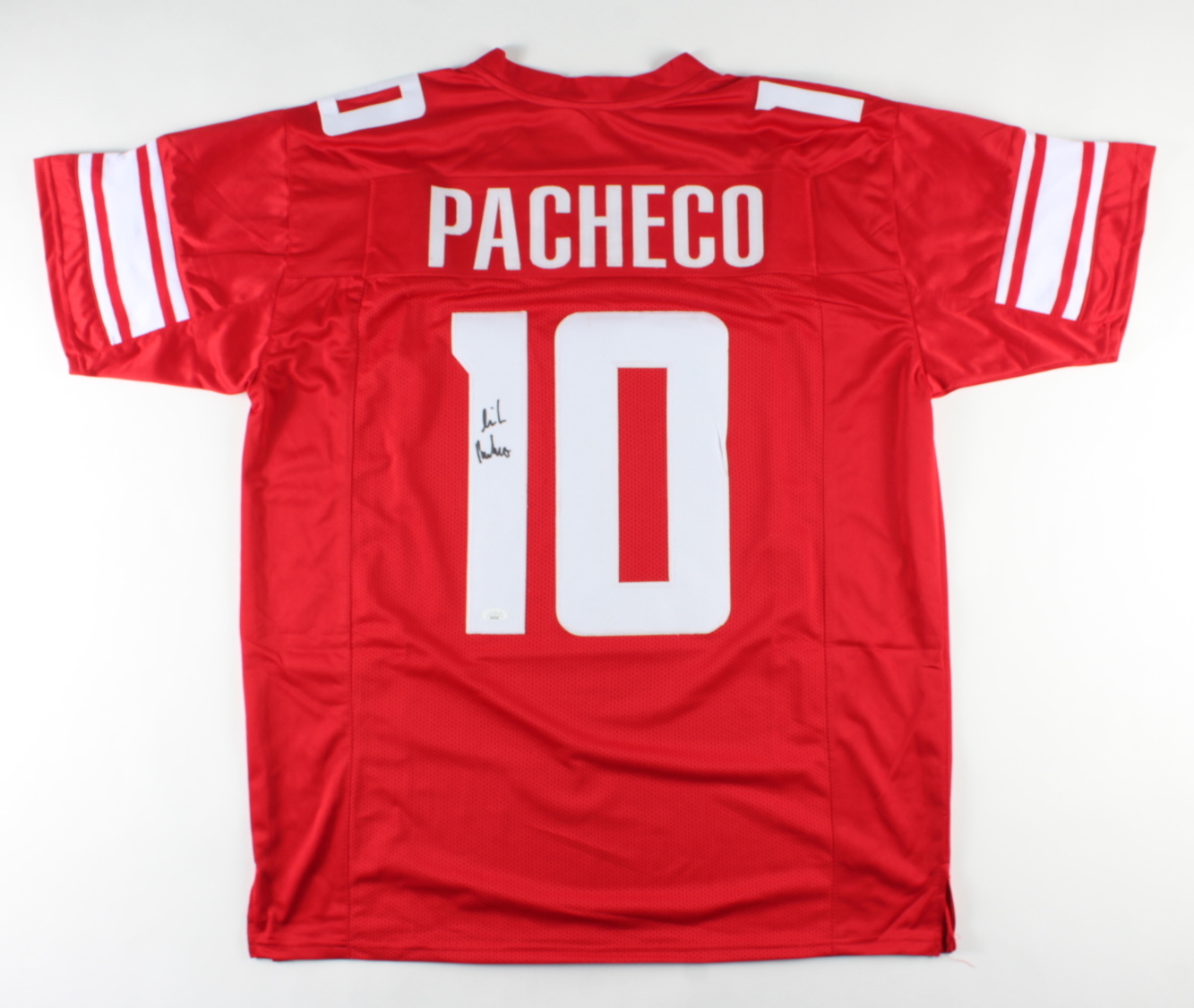 Custom on-field style jersey. Everything sewn on, size XL. Hand-signed by Isaih Pacheco.