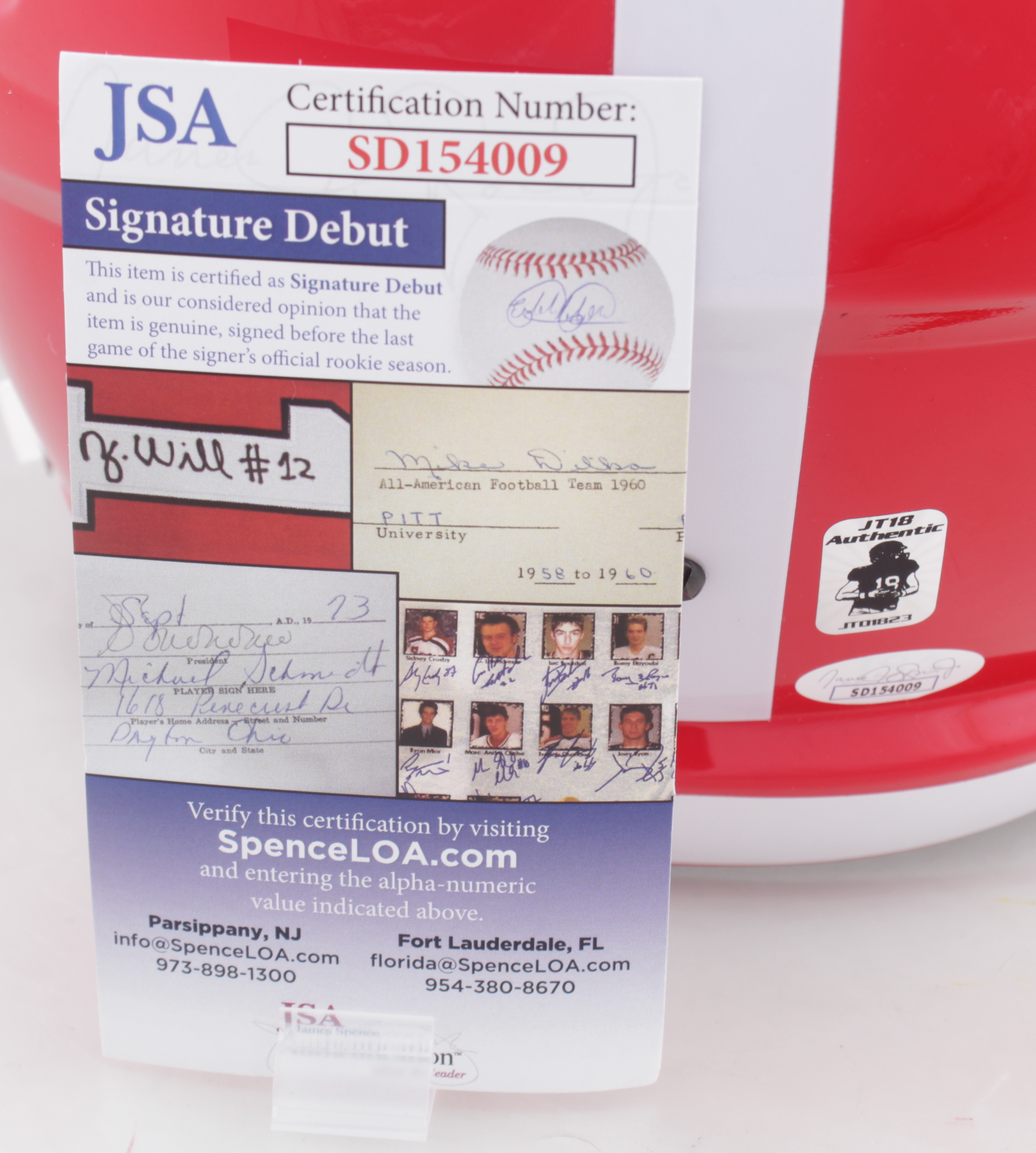 The autograph(s) includes an official James Spence Authentication (JSA) "Signature Debut" hologram and COA. "Signature Debut" is the autographed memorabilia equivalent to a rookie card. The JSA definition of a "Signature Debut" is as follows: "Any item that is autographed and received by JSA prior to the last game of the signer's official rookie season.