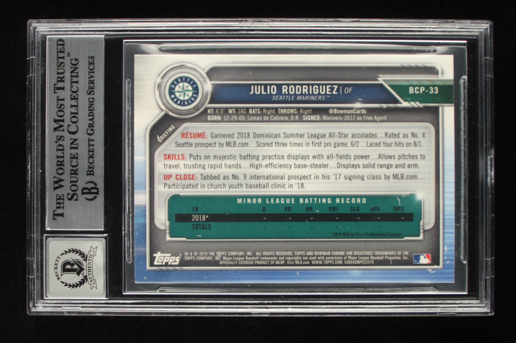 Julio Rodriguez Signed 2019 Bowman Chrome Prospects #BCP33 (BGS Encapsulated)