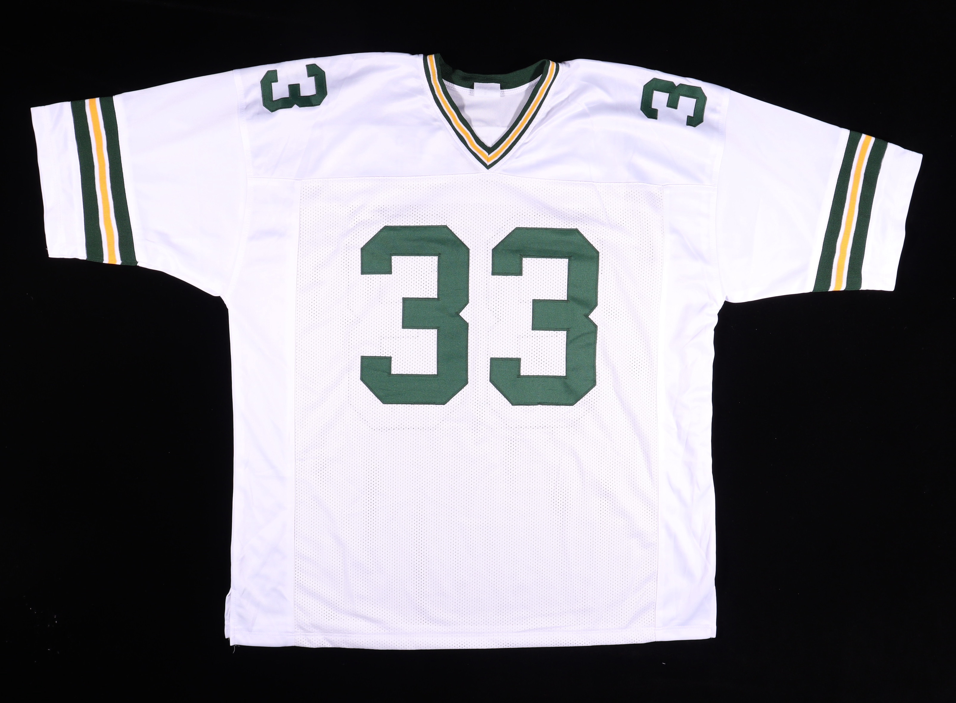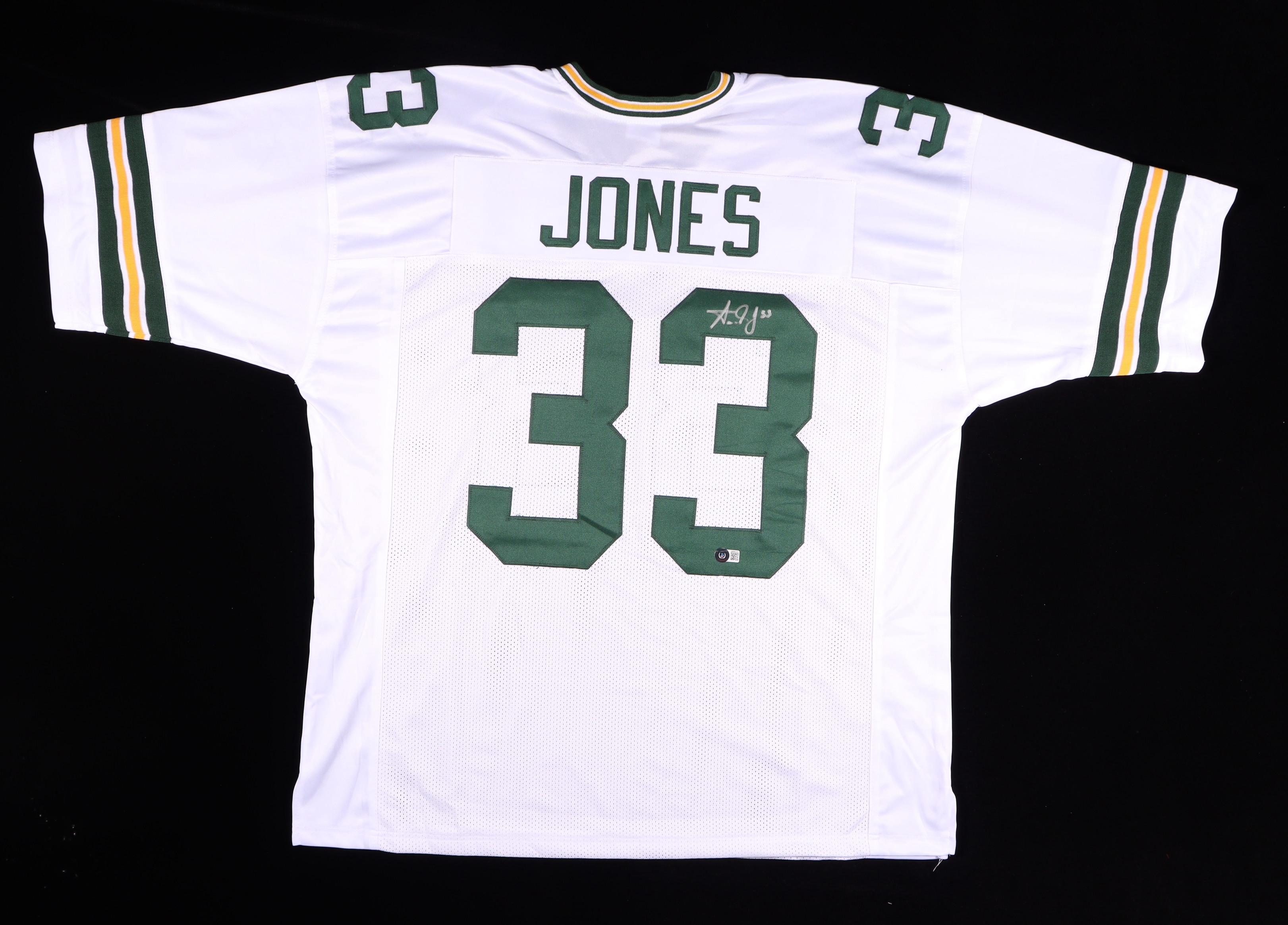 Custom on-field style jersey. Everything is sewn on, size XL. Hand-signed by Aaron Jones.