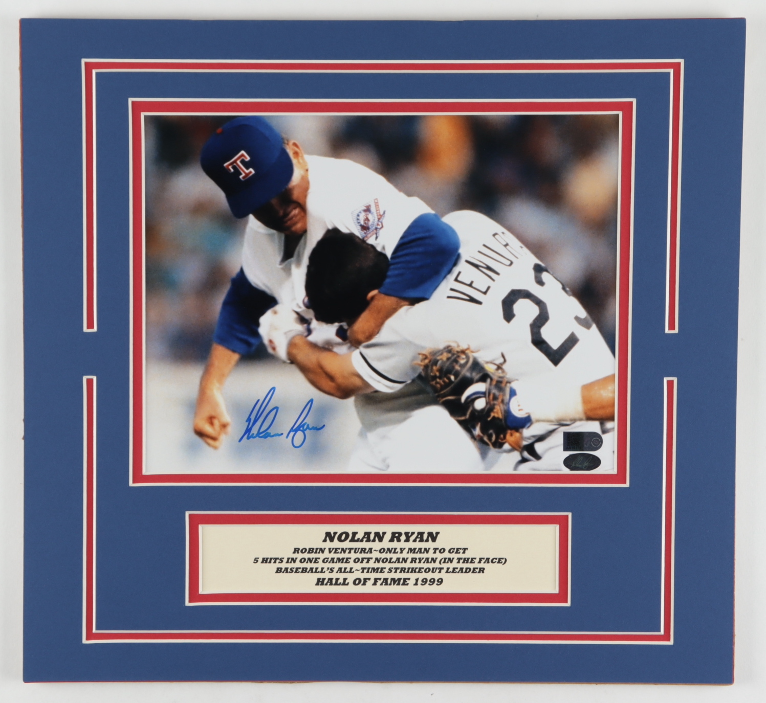 Matted photo display measures 13" x 14" in size and has been hand signed by Nolan Ryan (Texas Rangers, HOF).