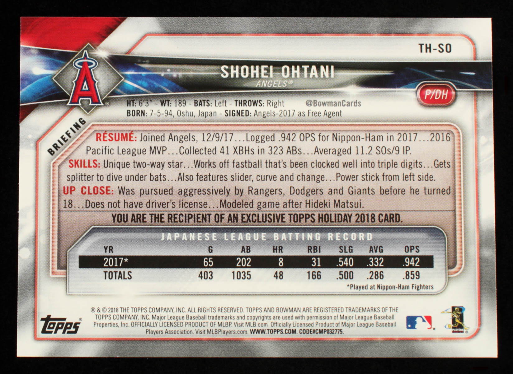 Shohei Ohtani 2018 Topps Bowman Holiday #THSO