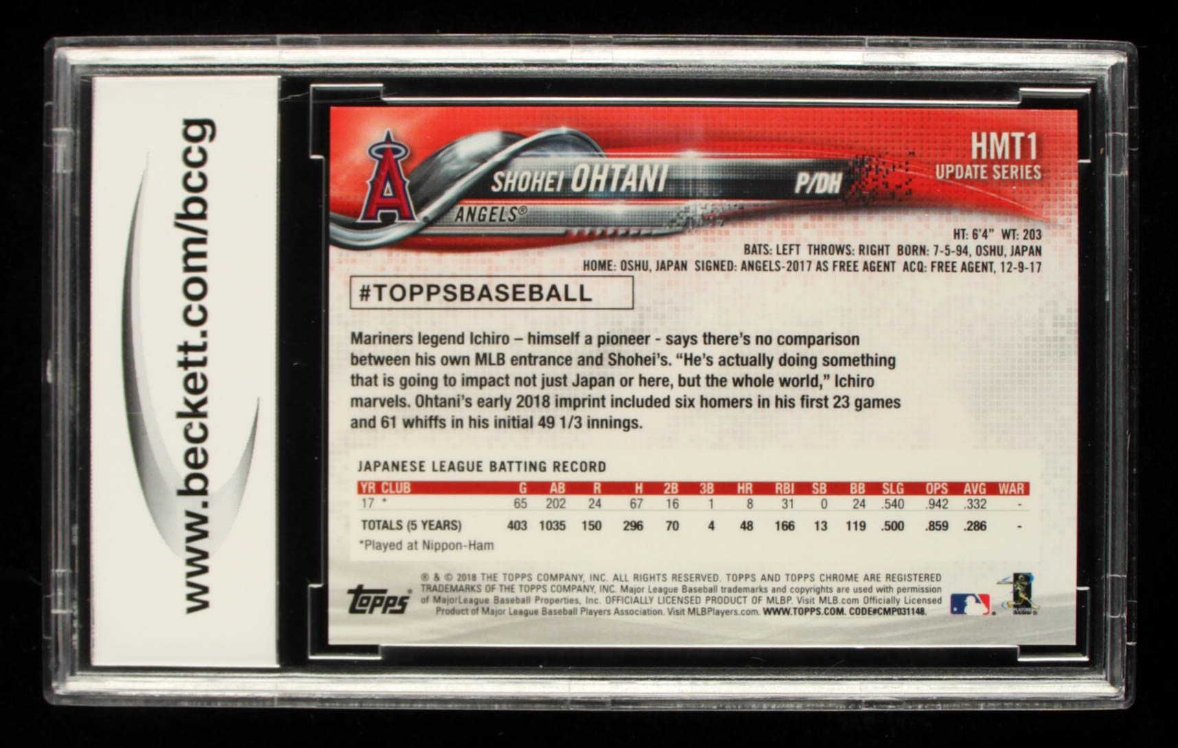 Shohei Ohtani 2018 Topps Chrome Update Pink Refractors #HMT1 (BCCG 10)