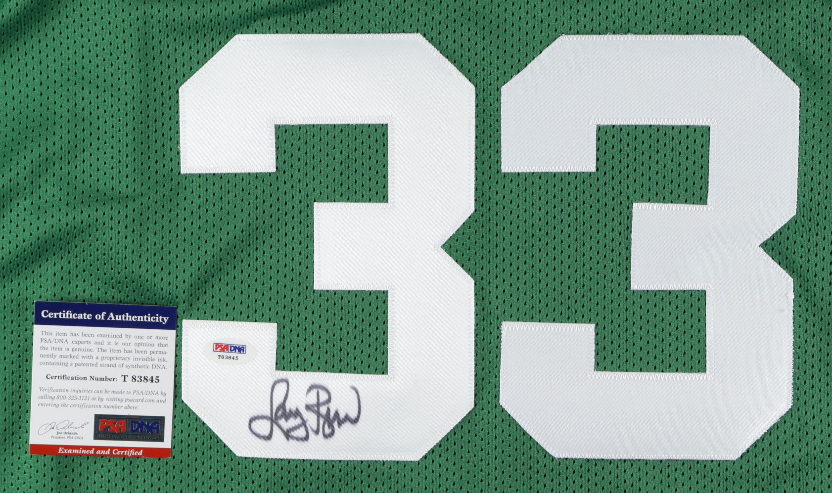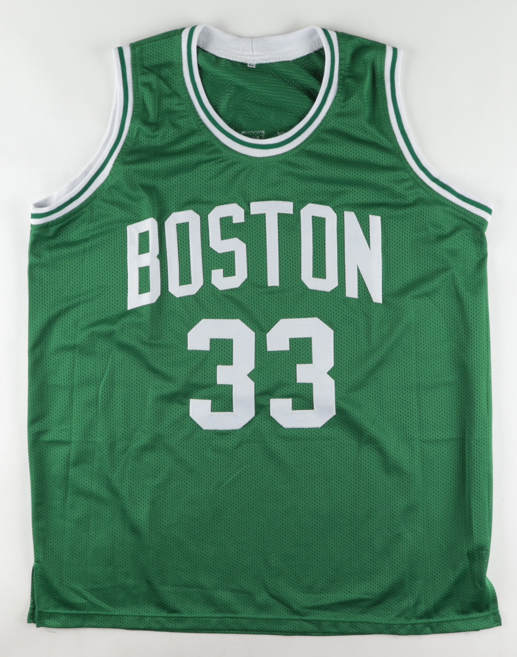 Custom on-court style jersey. Everything sewn on, size XL. Has been hand-signed and inscribed by Larry Bird (HOF).