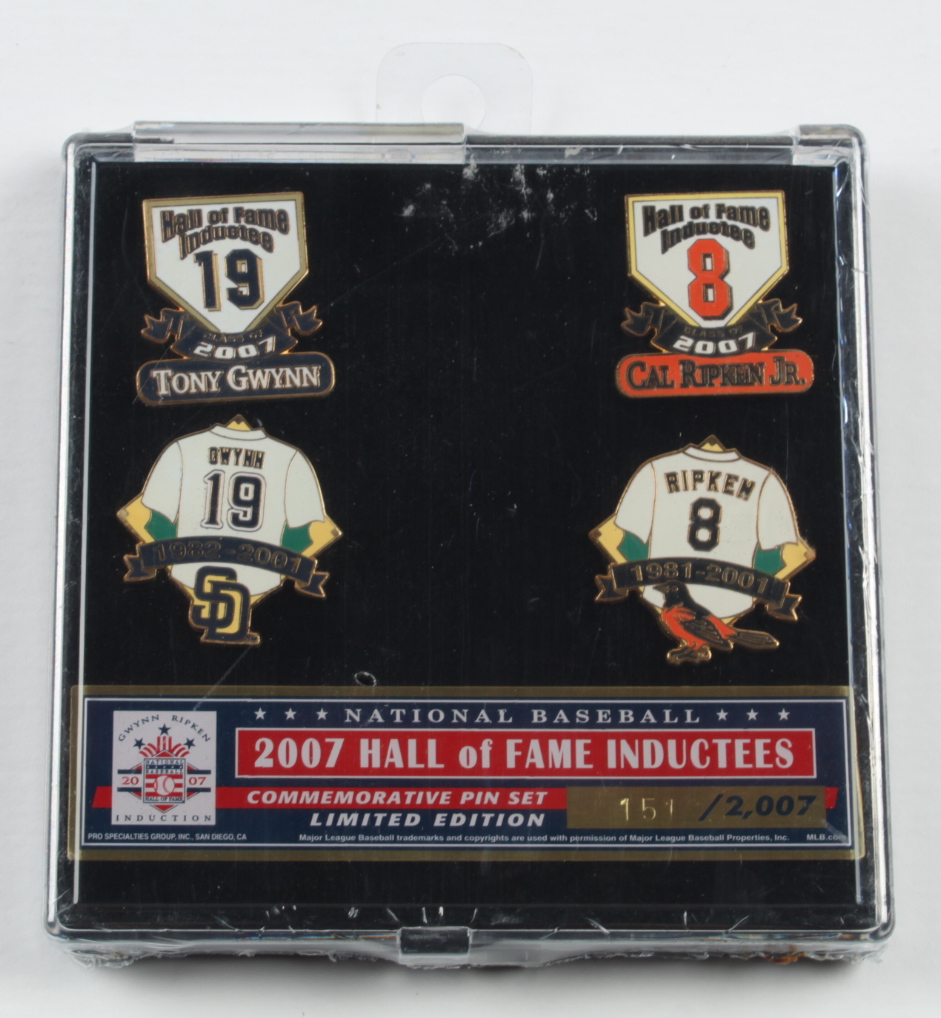 Complete set of (4) pins as shown. These commemorative pins feature (5) inductees of the 2000 Baseball Hall Of Fame Including Tony Gwynn and Cal Ripken Jr.. The pin set is limited edition #151/2,007. The pin set is factory sealed.