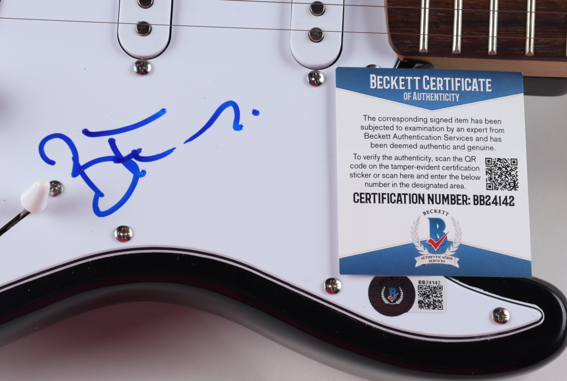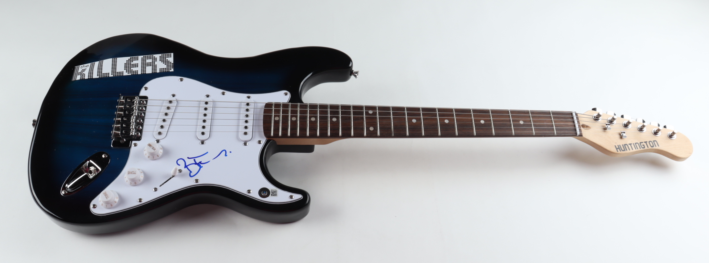 Electric guitar measures 38.5" in length and has been hand-signed on the pickguard by Brandon Flowers.
