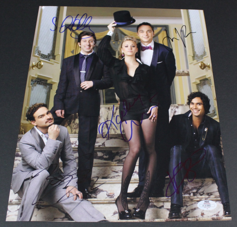 Signed by 5 including: Johnny Galecki, Jim Parsons, Kaley Cuoco, Simon Helberg, and Kunal Nayyar.. Hand-signed in blue/black felt tip pen. Authenticated by Autograph Certification Experts (ACE) and includes an official ACE serially numbered hologram and matching COA.
