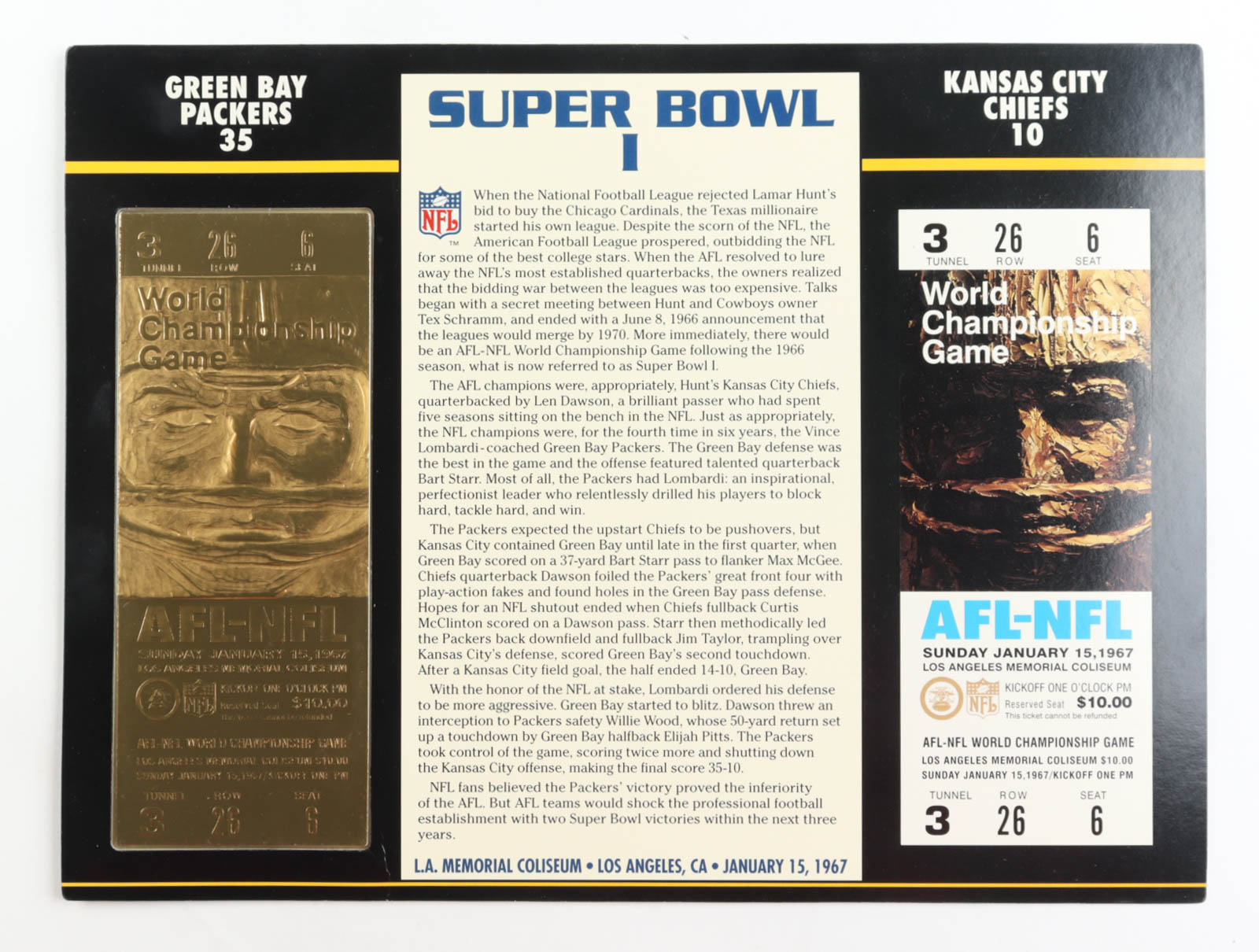 1967 Commemorative First Super Bowl I Card with Ticket: Packers vs Chiefs