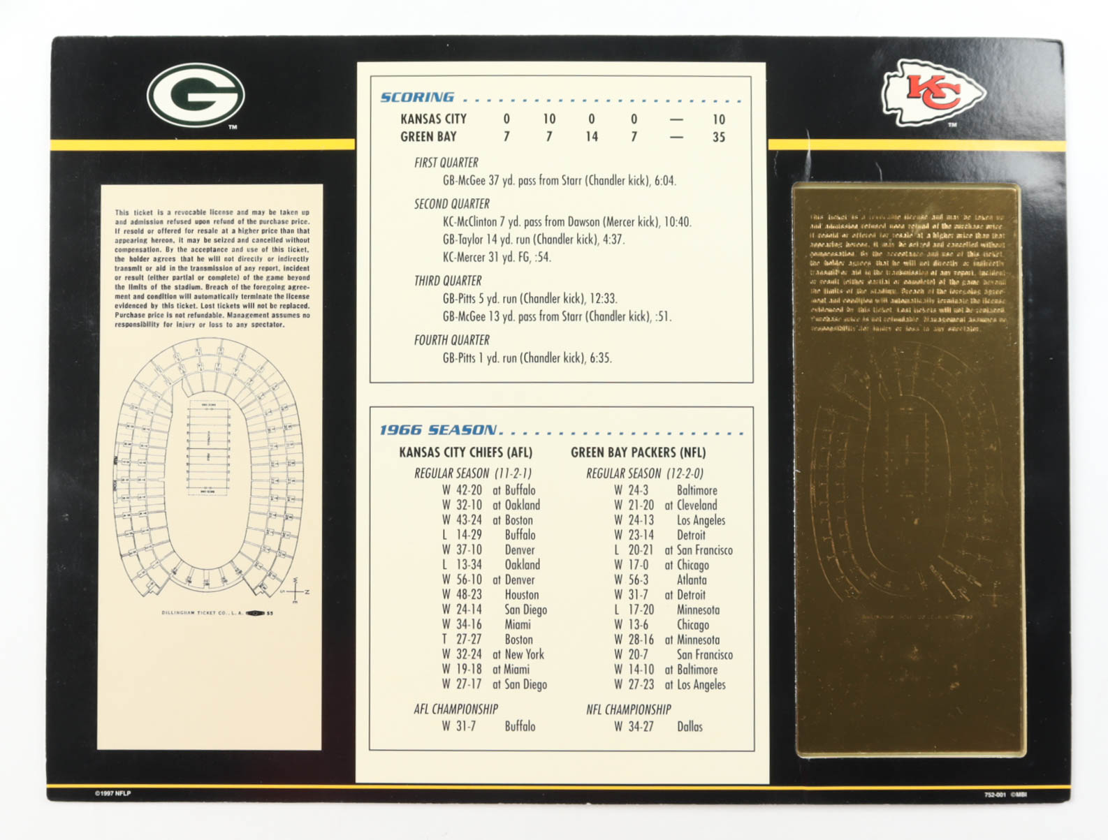 Official scorecard measures 9" x 12" in size and features a Green Bay Packers vs Kansas City Chiefs replica gold First Super Bowl I ticket.