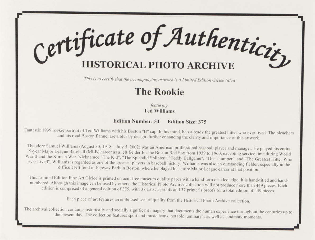 Historical Photo Archive - Ted Williams "The Rookie" Limited Edition 10x14.5 Fine Art Giclee on Paper #54/375 (PA LOA)