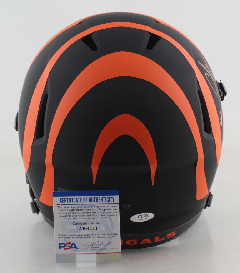Riddell Cincinnati Bengals full-size Eclipse Alternate Speed replica helmet. Has been hand-signed and inscribed by Chad Johnson.