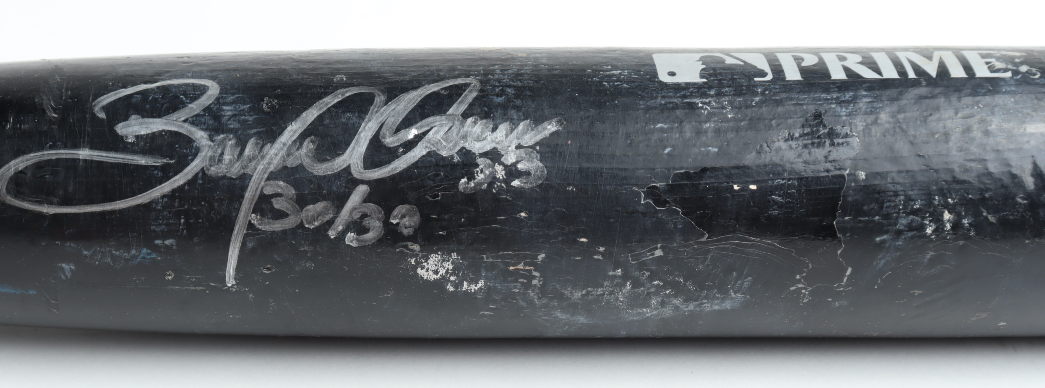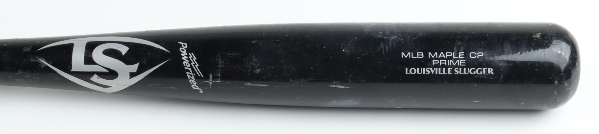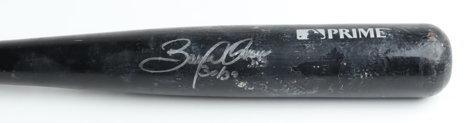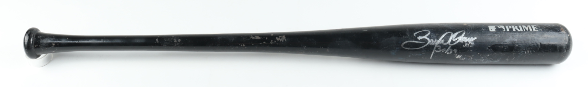 Louisville Slugger Prime Maple CP baseball bat. Hand-signed and inscribed by Bobby Abreu (Philadelphia Phillies). Please note, the bat has been game-used and has been cracked by an unknown player.