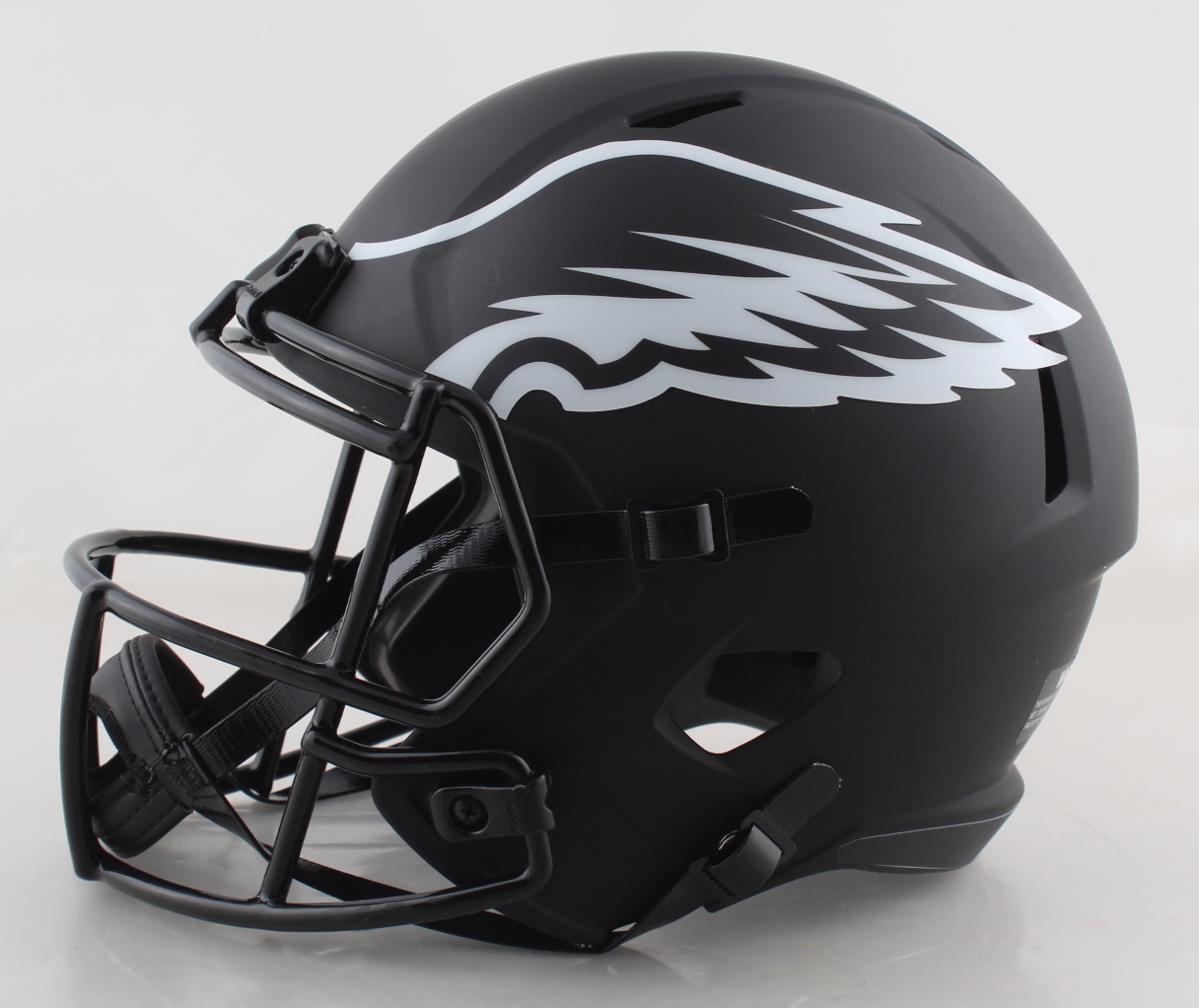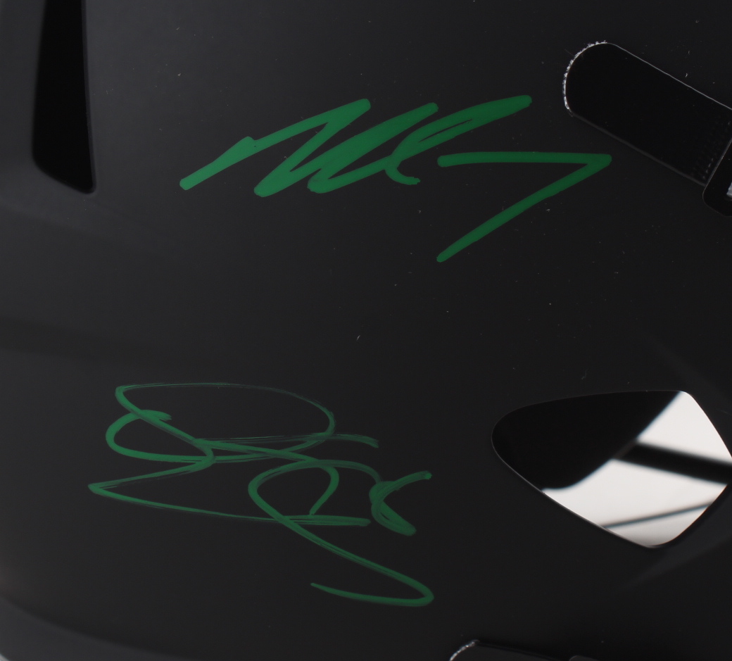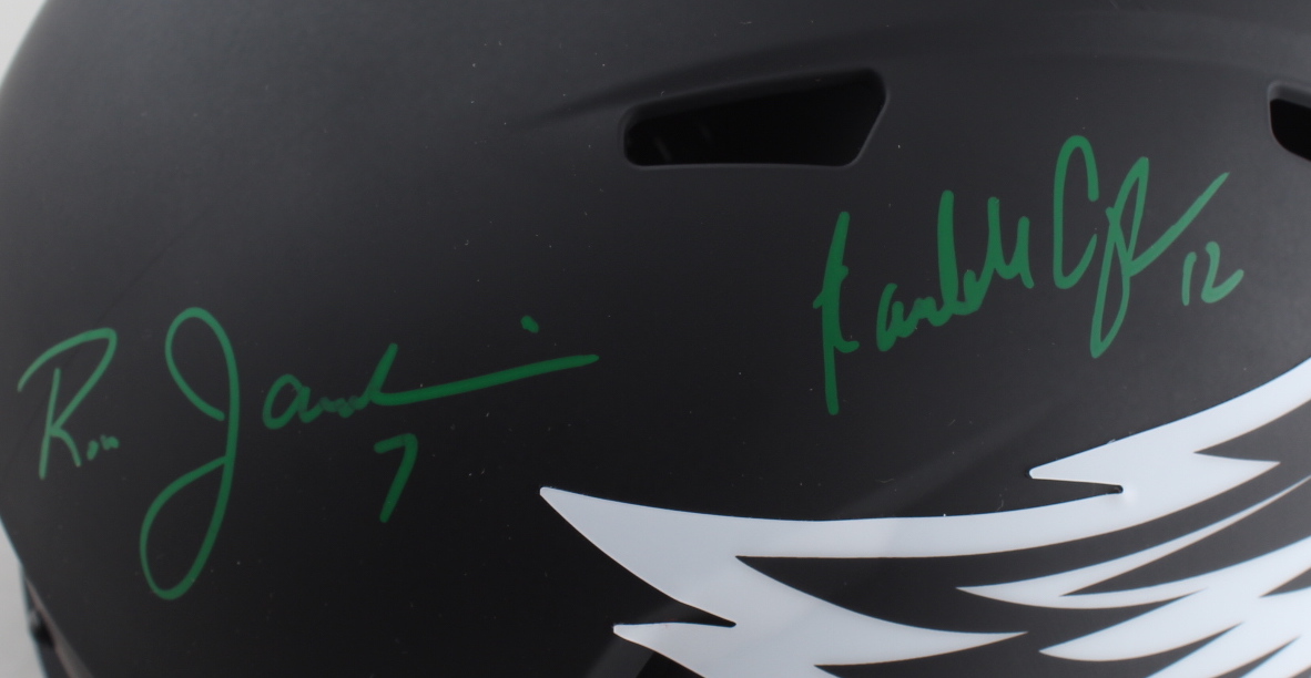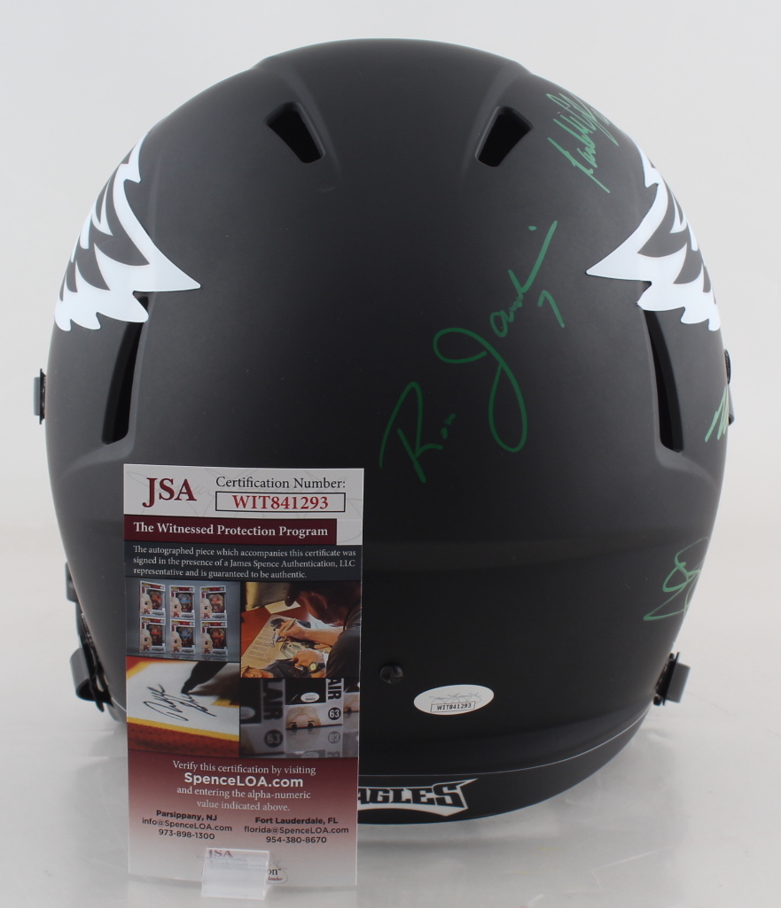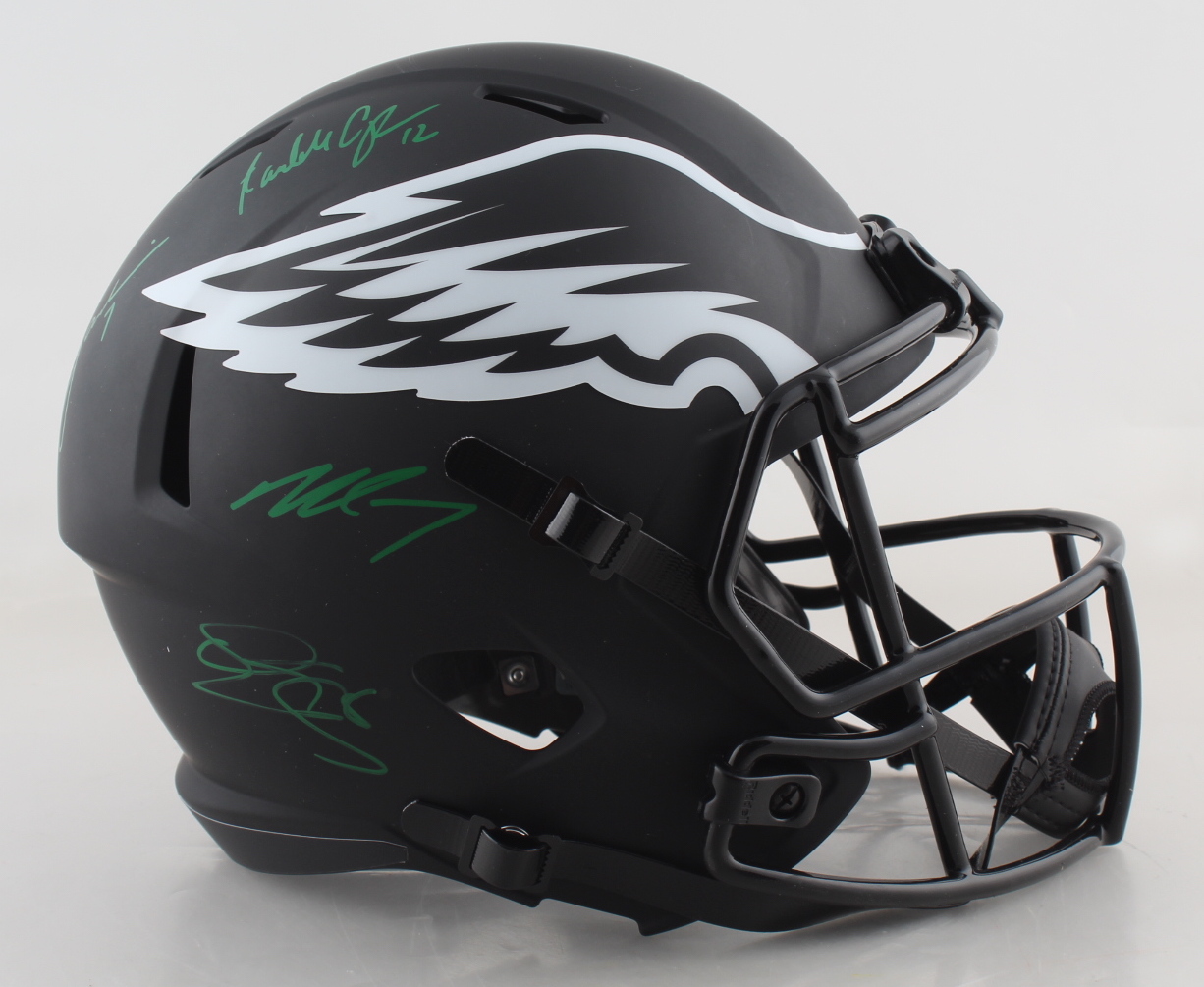 Riddell Philadelphia Eagles full-size replica eclipse alternate speed helmet has been hand-signed by (4) including Donovan McNabb, Randall Cunningham, Ron Jaworski, and Michael Vick.