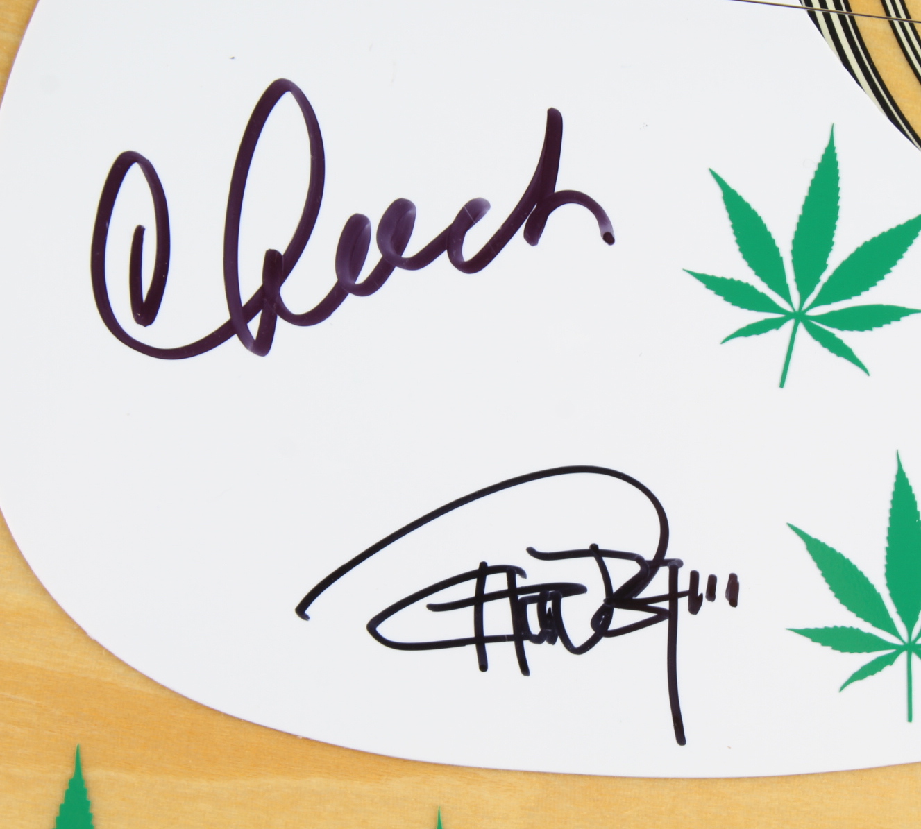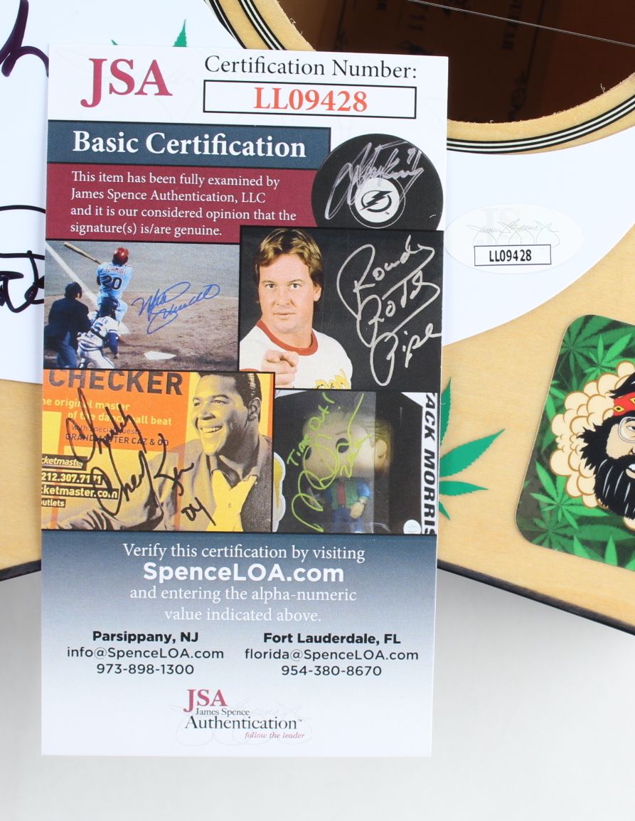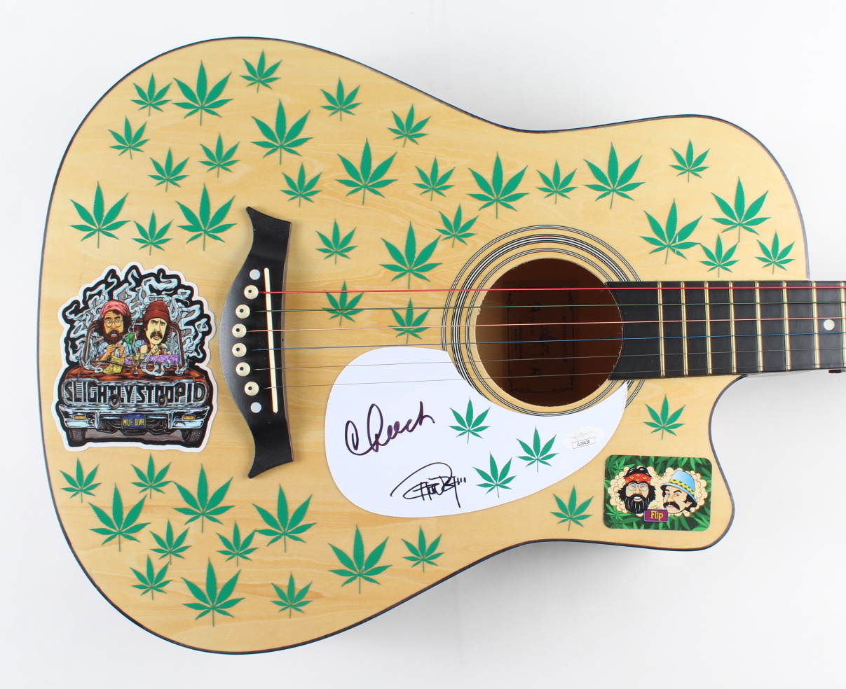 Acoustic guitar measures approximately 38" in length and has been hand-signed by Cheech Marin and Tommy Chong. This guitar is a display guitar. It is a lower-tier version and is not the same quality as one that a musician would play.