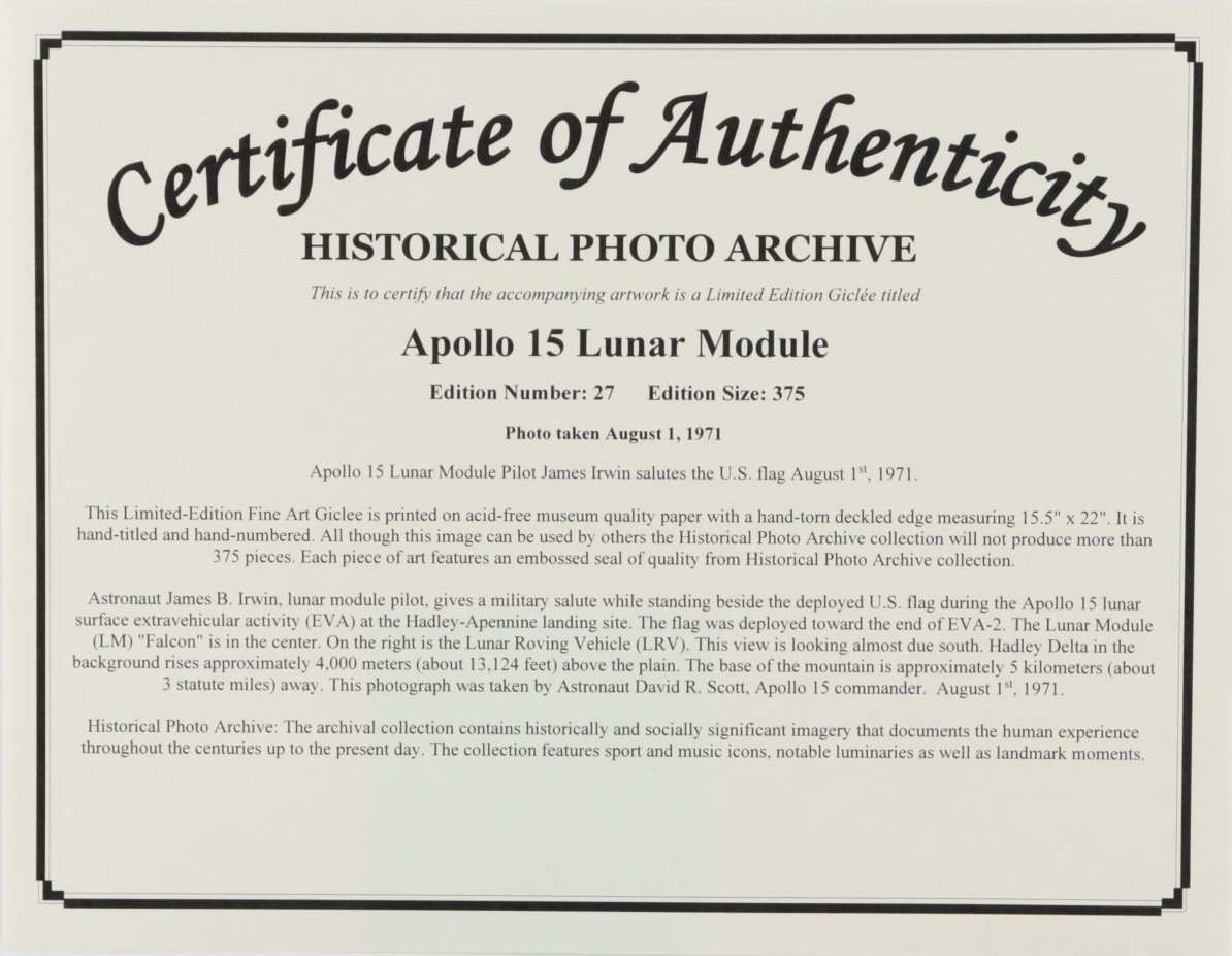 Historical Photo Archive - "Apollo 15 Lunar Module" Limited Edition 16.5x22 Fine Art Giclee on Paper #27/375 (PA LOA)