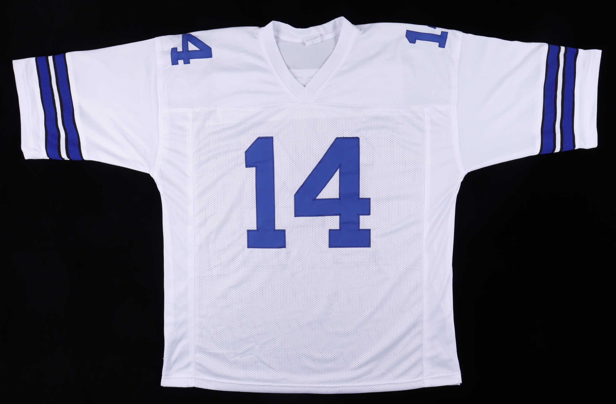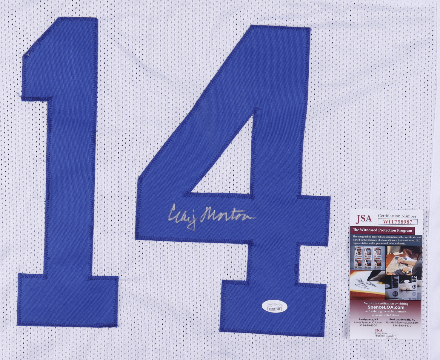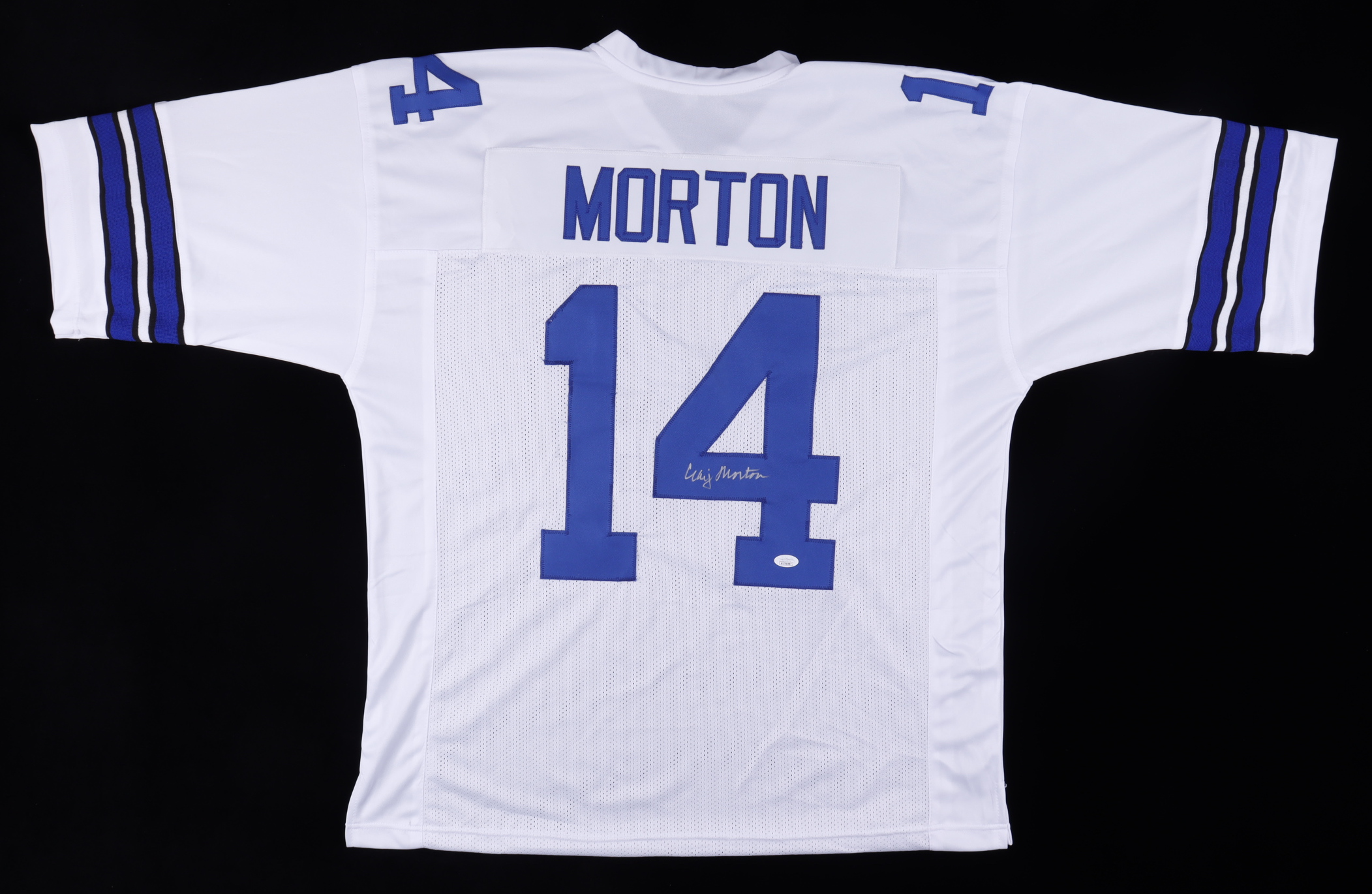 Custom on-field style jersey. Everything is sewn on, size XL. Hand-signed by Craig Morton. Please note, there are signs of staining on the jersey's lower back, the inside of the collar and the right sleeve.