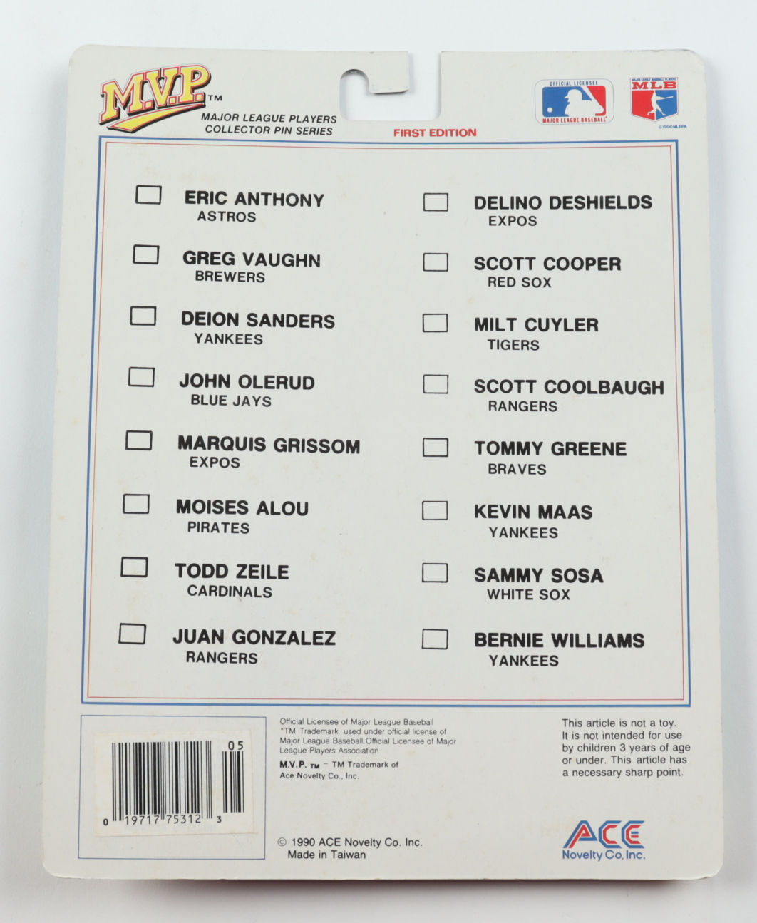 1990 Ace Novelty MLB Collector Pin Series M.V.P. Premier Rookie Edition Bernie Williams pin with Score baseball card (New York Yankees).