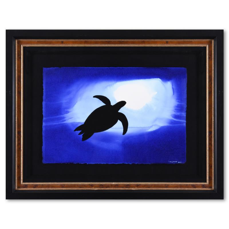 "Turtle Shadow" is an original watercolor painting on deckle edge paper by Wyland, hand signed by the artist. This piece comes framed. Includes Letter of Authenticity. Measures approx. 34" x 26.5" (framed), 22" x 15" (image). ** Please note: There is noticeable wear on the frame as well as small scuffs on the acrylic protective cover. **