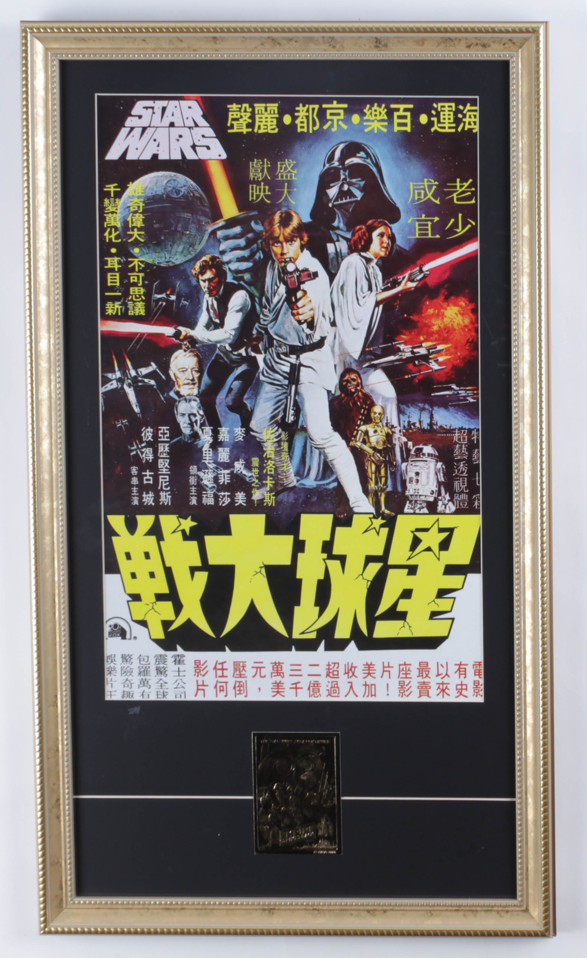 Custom frame measures 15" x 26" in size and features a China release print from the film "Star Wars". Also includes a 23 KT gold card.