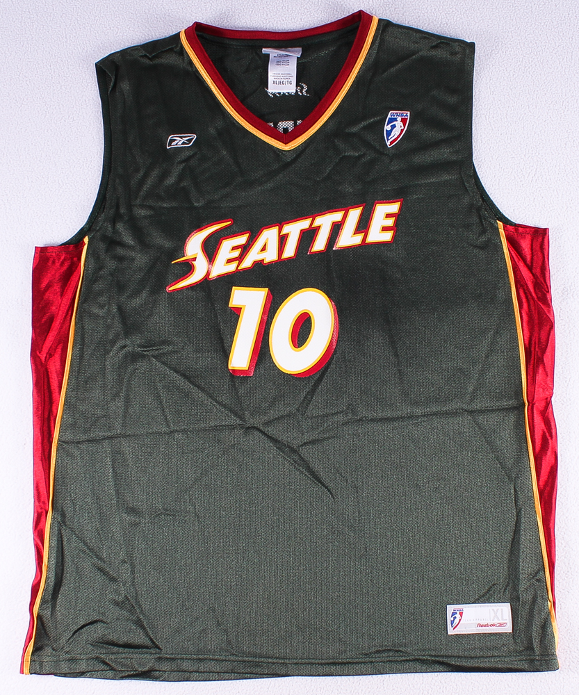 Reebok on-court style jersey. Everything is sewn on, size XL. Hand-signed in black felt tip pen by Sue Bird (Storm)