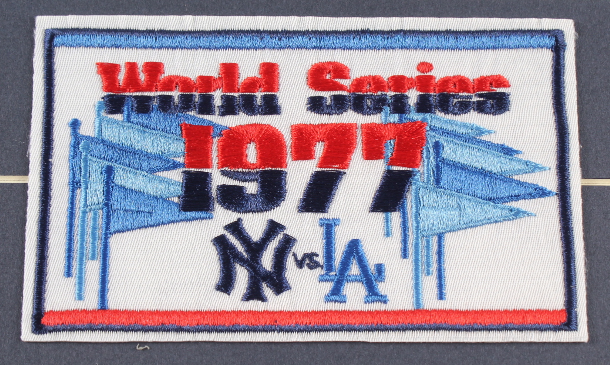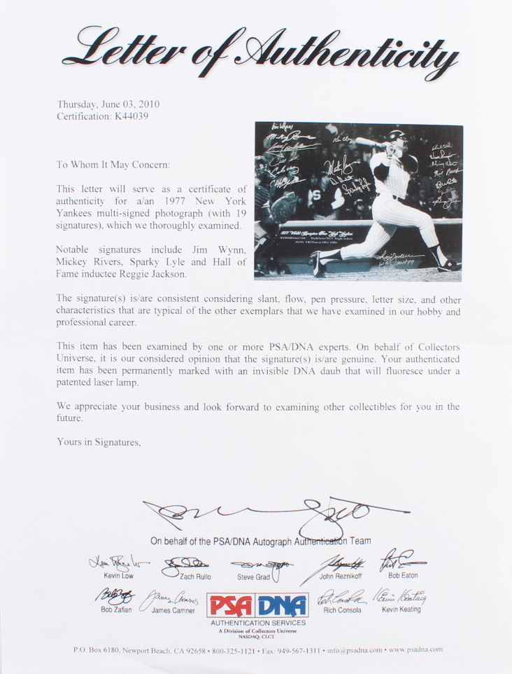Frame measures 22" x 24" in size and features a photo that has been signed by (19) members of the 1977 New York Yankees World Series Champions team including Reggie Jackson, Mickey Rivers, Gil Patterson, Jimmy Wynn, Carlos May, Cliff Johnson, Sparky Lyle, Ken Clay, Marty Perez, Don Gullett, George Zeber and Mickey Klutts. The display also features a 1977 World Series patch and vintage pin.