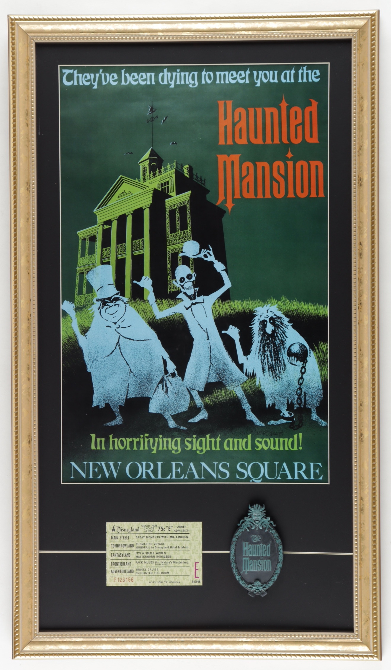 Disneyland "Haunted Mansion" 15x26 Custom Framed Print Display with Vintage "E" Ticket Book & Ride Emblem