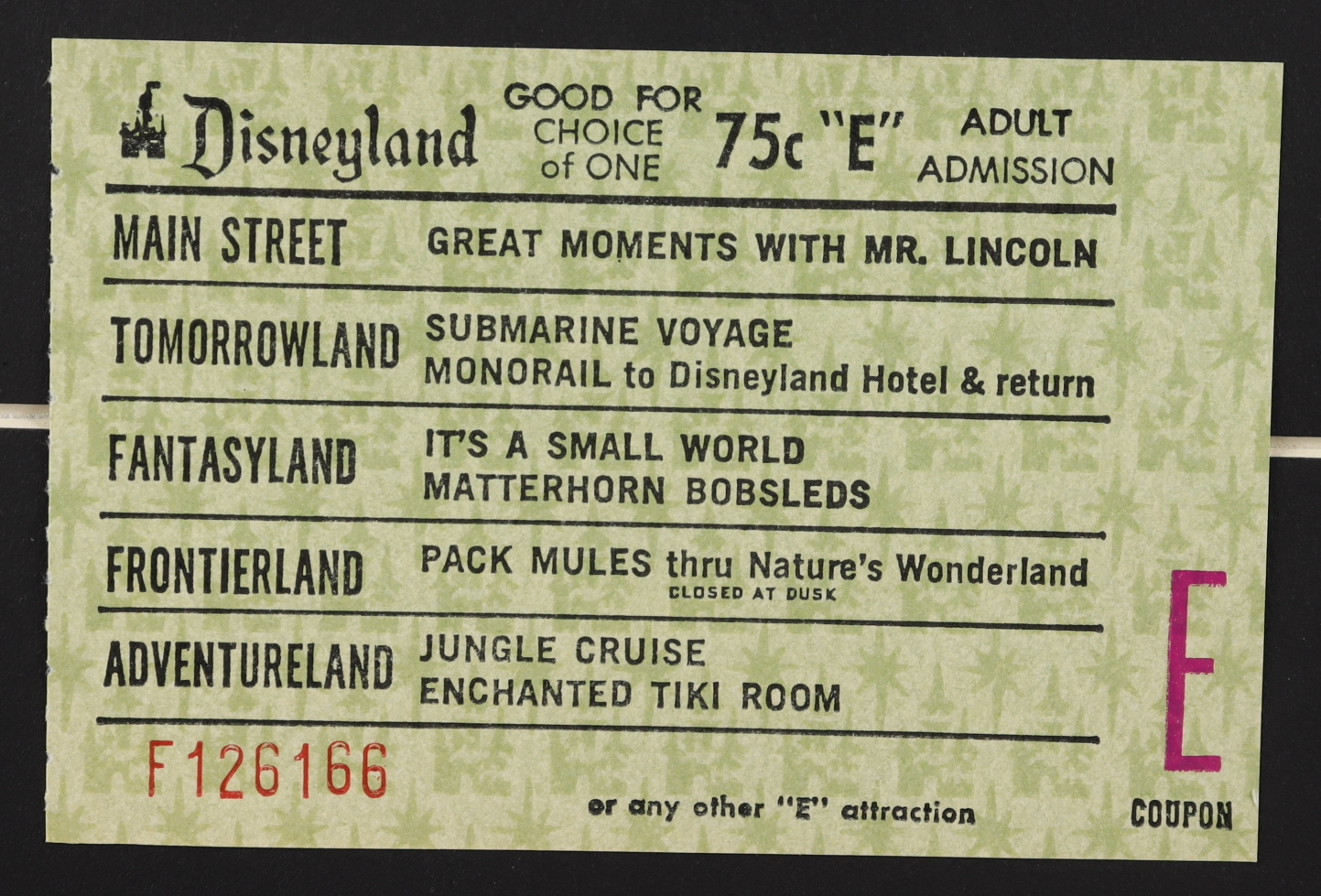 Custom framed display measures approximately 15" x 26" in size and features a print, vintage "E" Disneyland ticket book (.75) and a Haunted Mansion ride emblem.