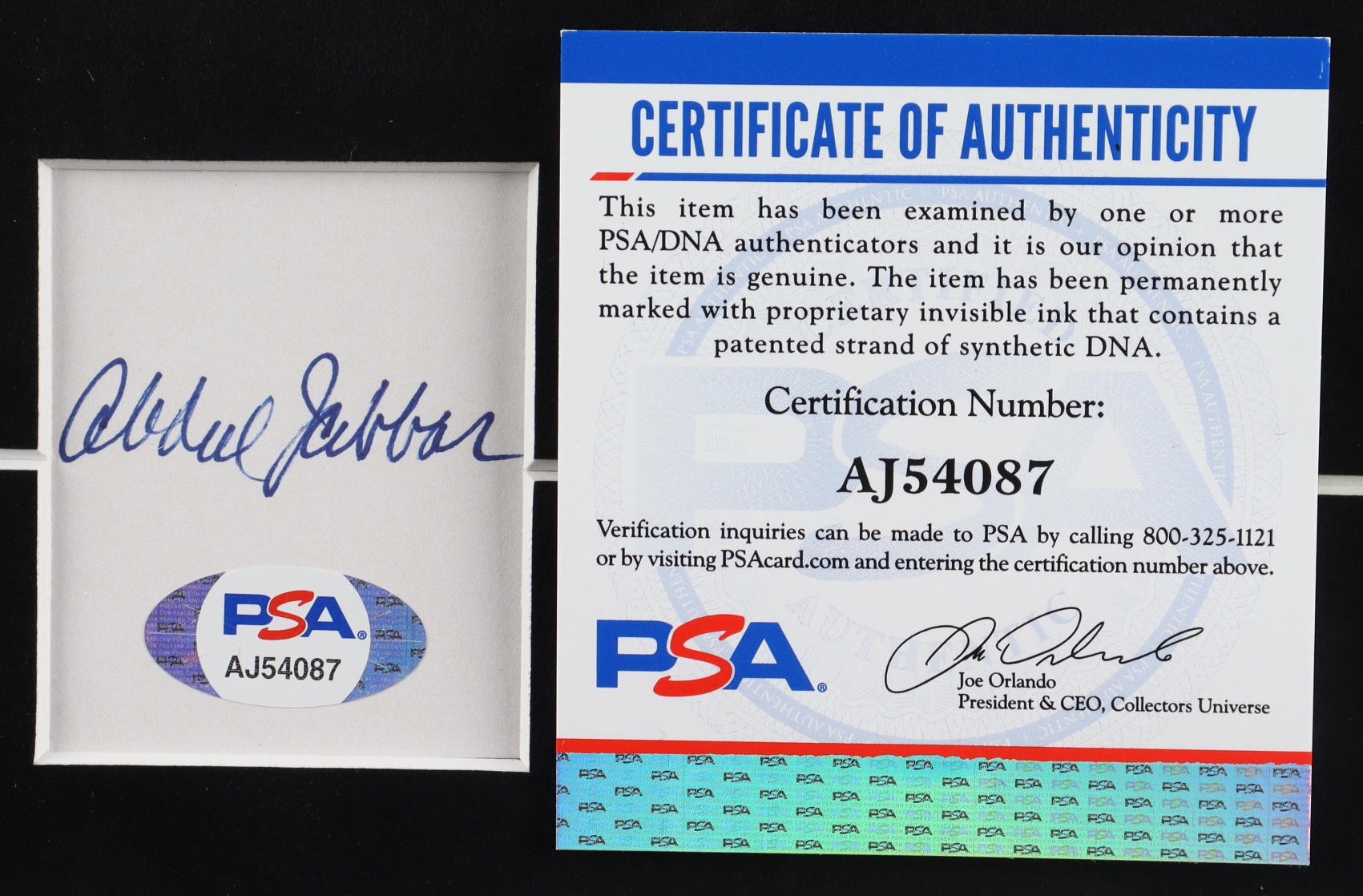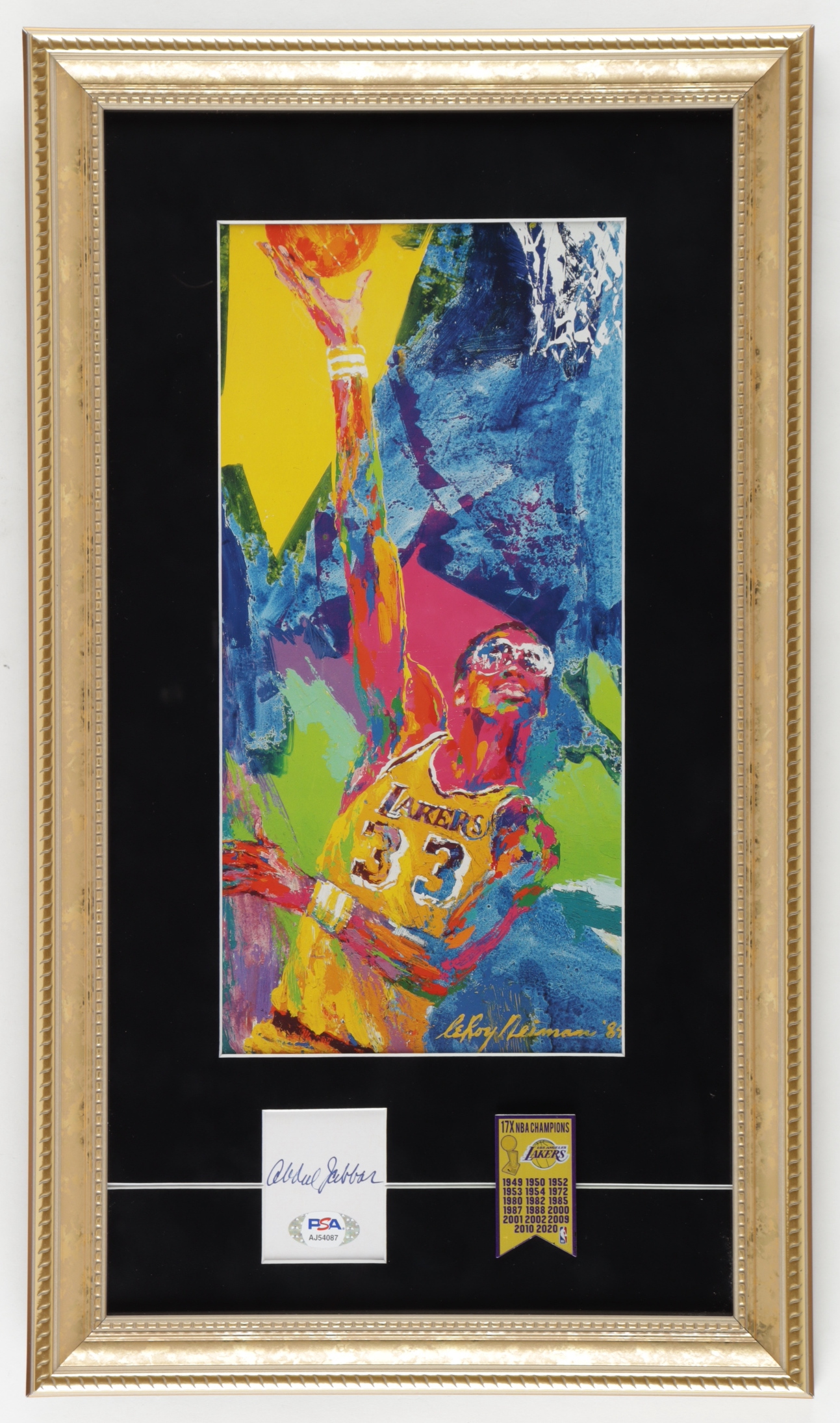 Kareem Abdul-Jabbar Signed 11x19 Cut Display with LeRoy Neiman LA Lakers Art Print & Mini Metal Championship Banner (PSA COA)