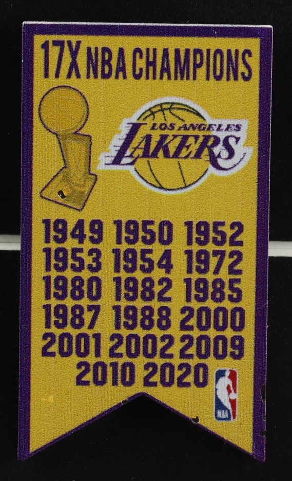 Frame measures approximately 11" x 19" in size and includes a cut hand-signed by Kareem Abdul-Jabbar (Los Angeles Lakers, HOF), as well as a print of LeRoy Neiman's LA Lakers art print and a mini metal championship banner.