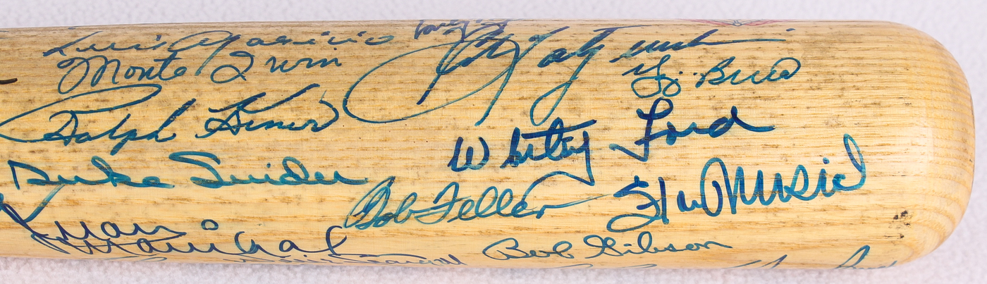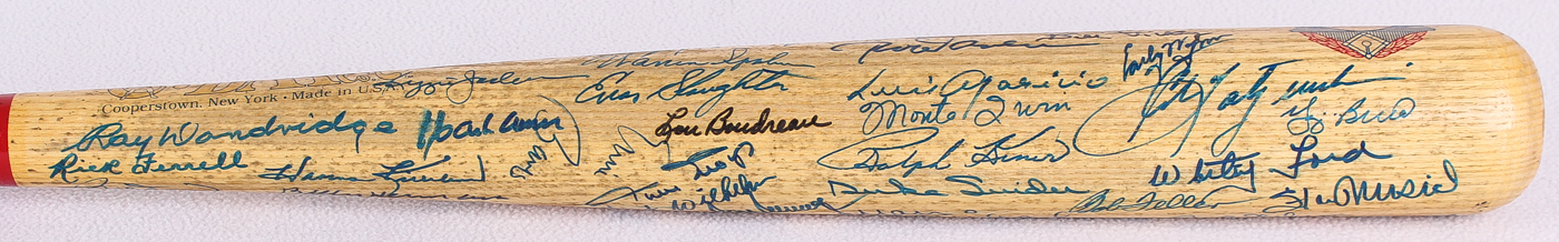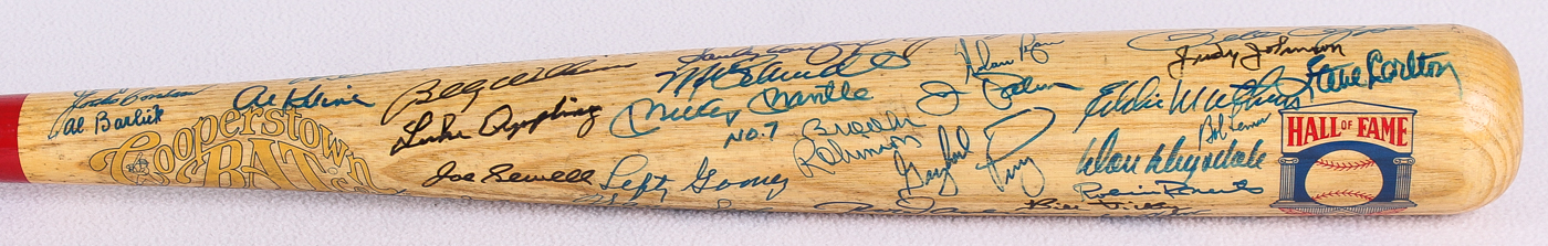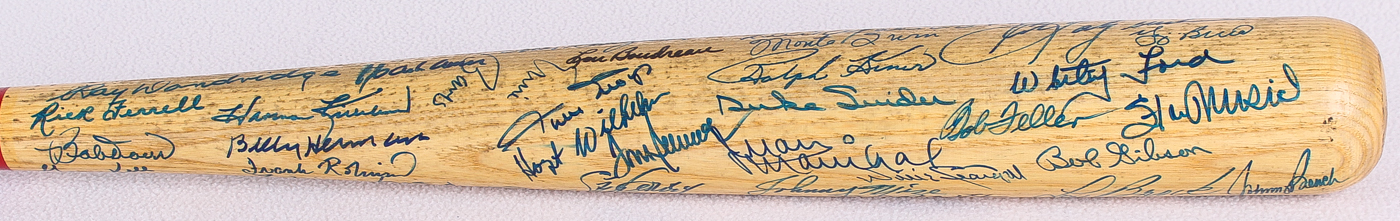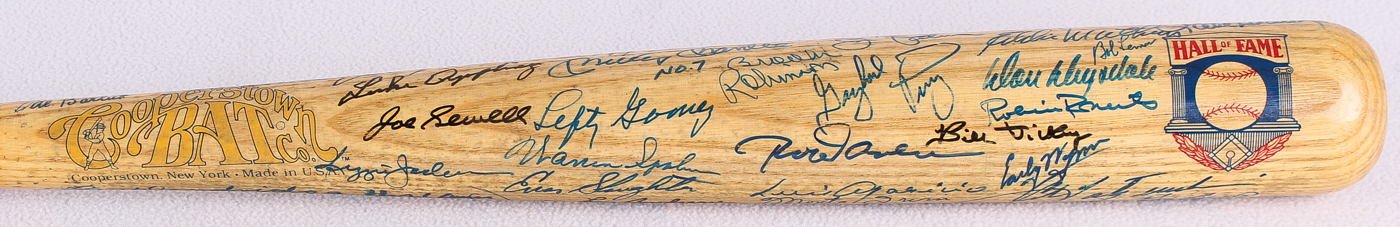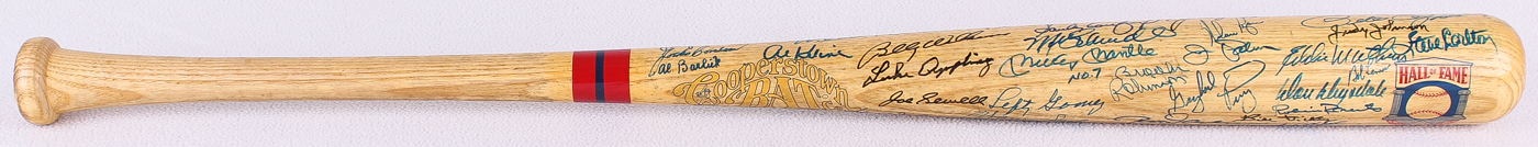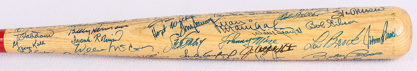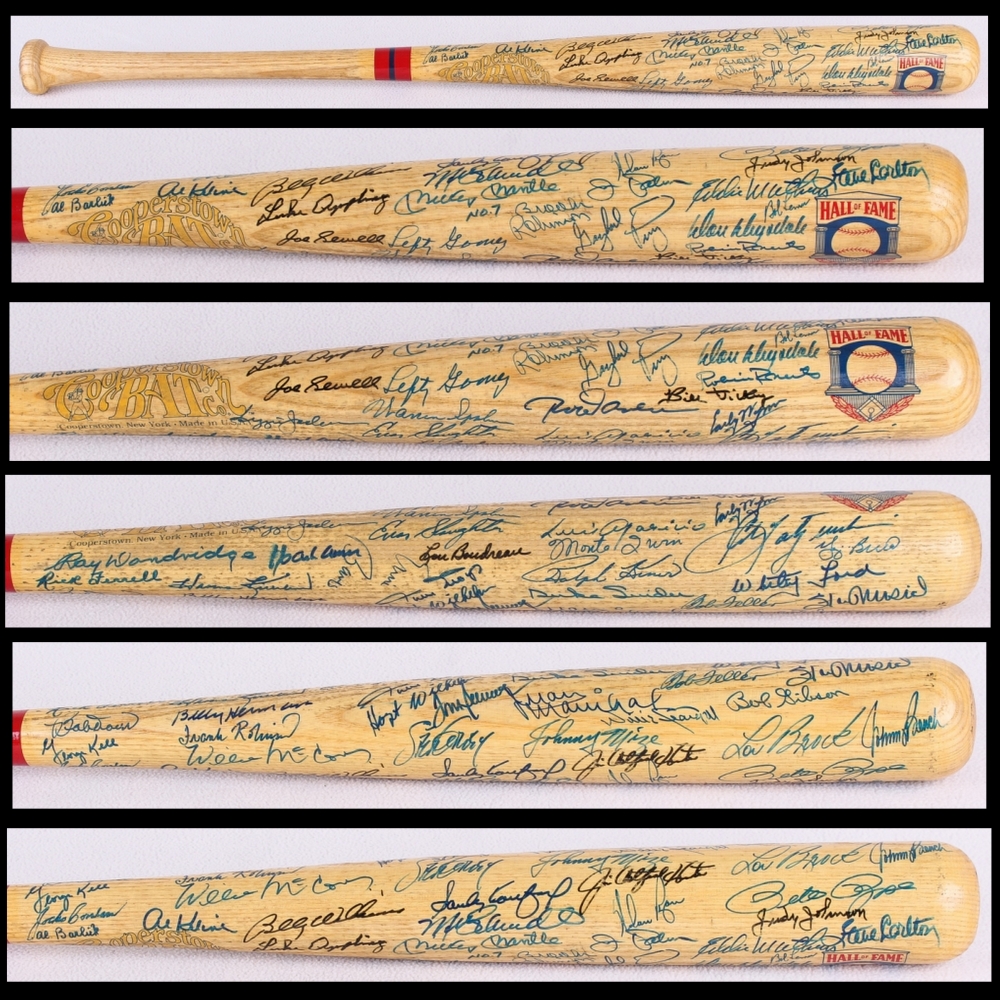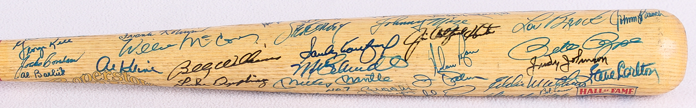 Cooperstown Hall of Fame logo baseball bat. Hand-signed by (57) baseball legends with Pete Rose, Lou Brock, Al Kaline, George Kell, Rick Ferrell, Ray Dandridge, Hank Aaron, Harmon Killebrew, Billy Herman, Frank Robinson, Willie McCovey, Al Kaline, Luke Appling, Joe Sewell, Billy Williams, Reggie Jackson, Lefty Gomez, Mickey Mantle, Mike Schmidt, Sandy Koufax, Steve Garvey, Tom Seaver, Hoyt Wilhelm, Willie Mays, Lou Boudreau, Enos Slaughter, Steve Carlton, Bob Lemon, Eddie Mathews, Johnny Bench, Warren Spahn, Ernie Banks, Brooks Robinson, Gaylord Perry, Jim Palmer, Nolan Ryan, Jim "Catfish" Hunter, Johnny Mize, Willie Stargell, Juan Marichal, Bob Feller, Duke Snider, Ralph Kiner, Monte Irvin, Luis Aparicio, Rod Carew, Don Drysdale, Robin Roberts, Bill Dickey, Early Wynn, Yogi Berra, Whitey Ford, Stan Musial, Bob Gibson, Judy Johnson and (2) others.