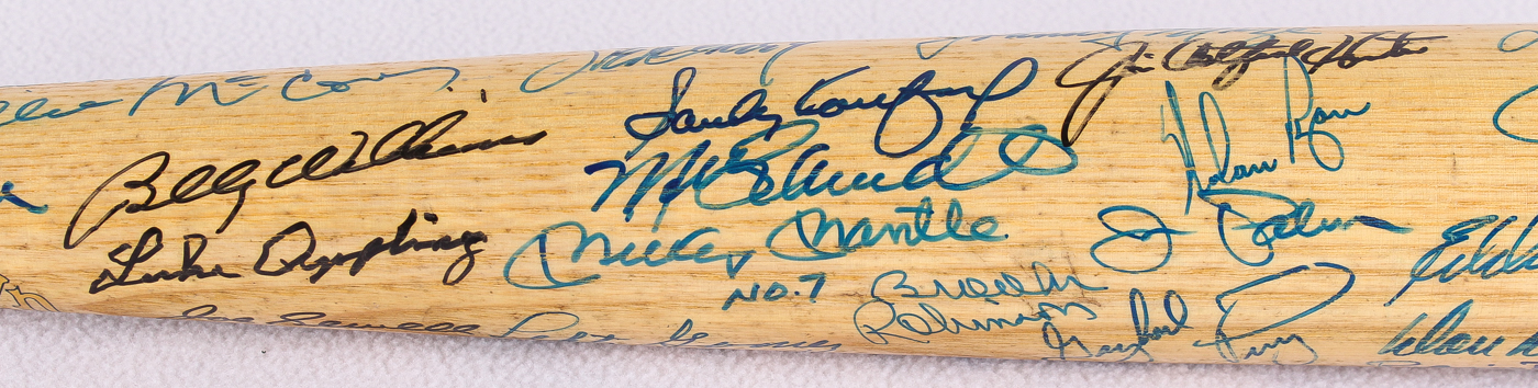 One feature enhancing the rarity of this bat is regarding Mickey Mantle's autograph. Mantle was well known to not enjoy signing baseball bats, or items with other signatures on them. On this rare collector's item we find not only his autograph and his inscribed "#7" on a baseball bat, but on one that is multi-signed. This feature truly enhances the rarity of this item.