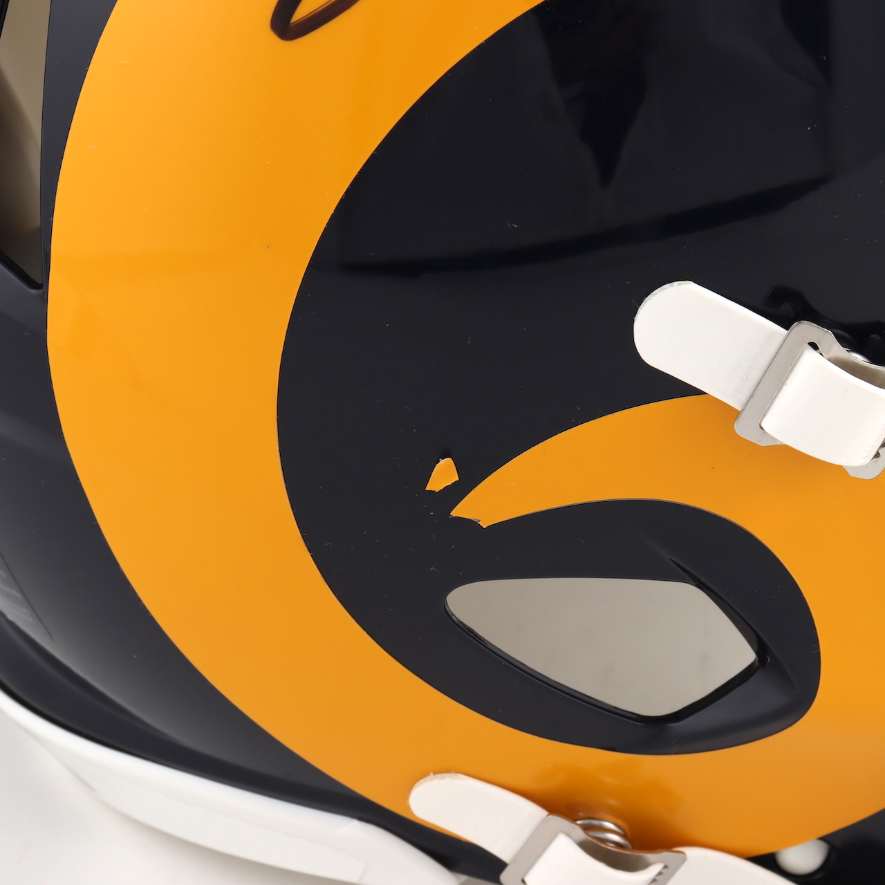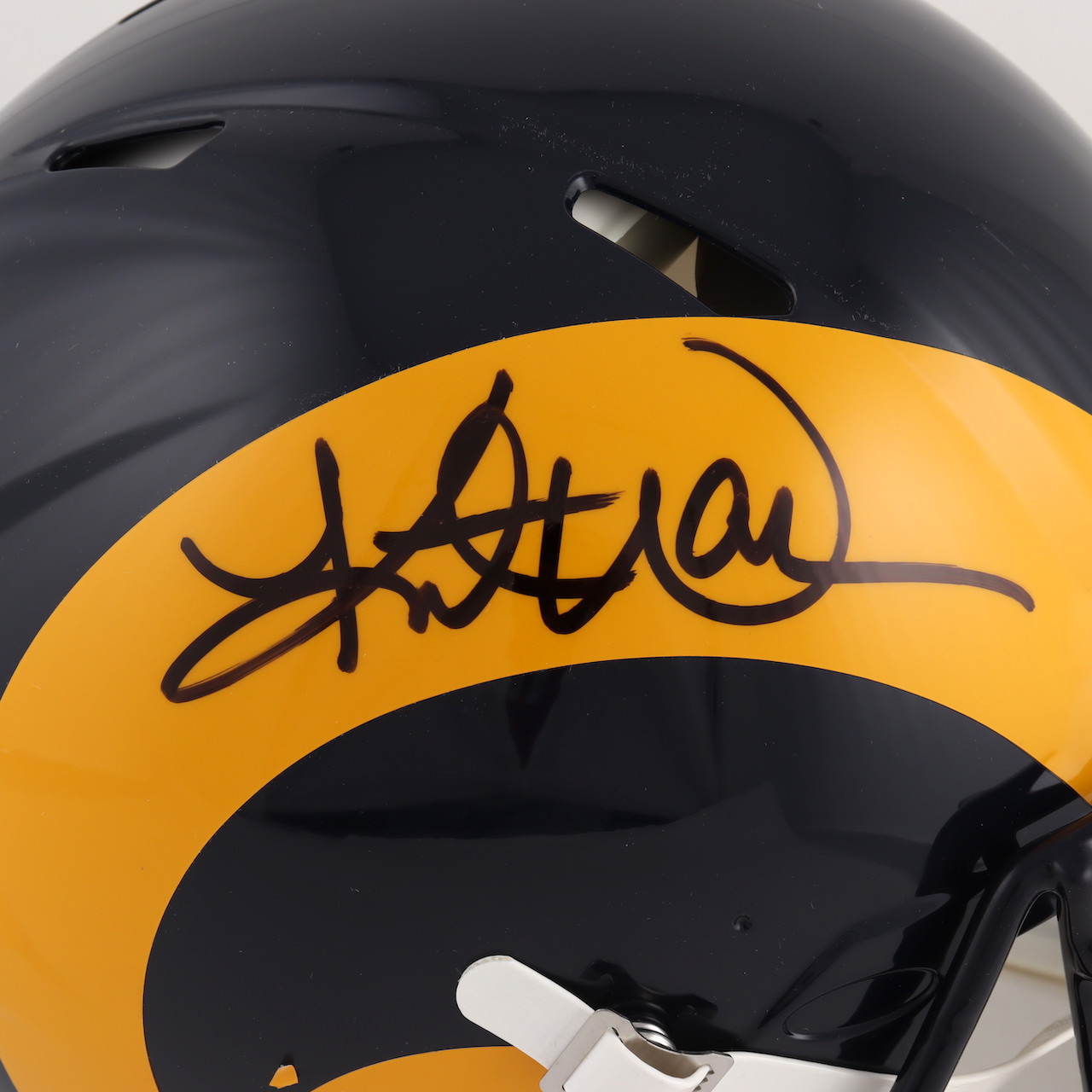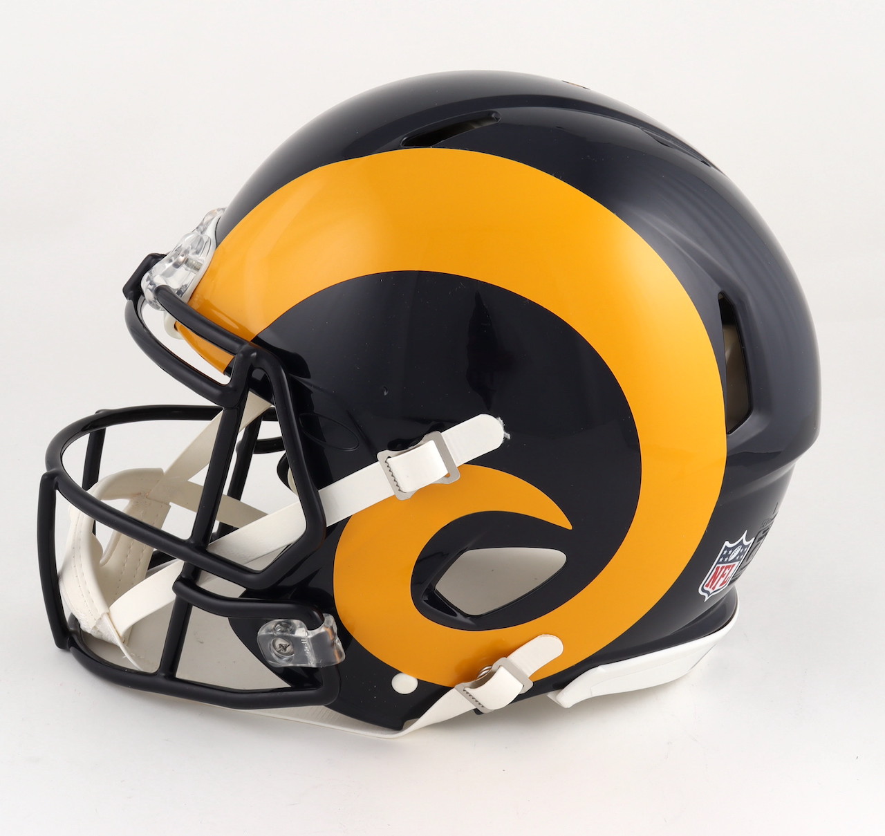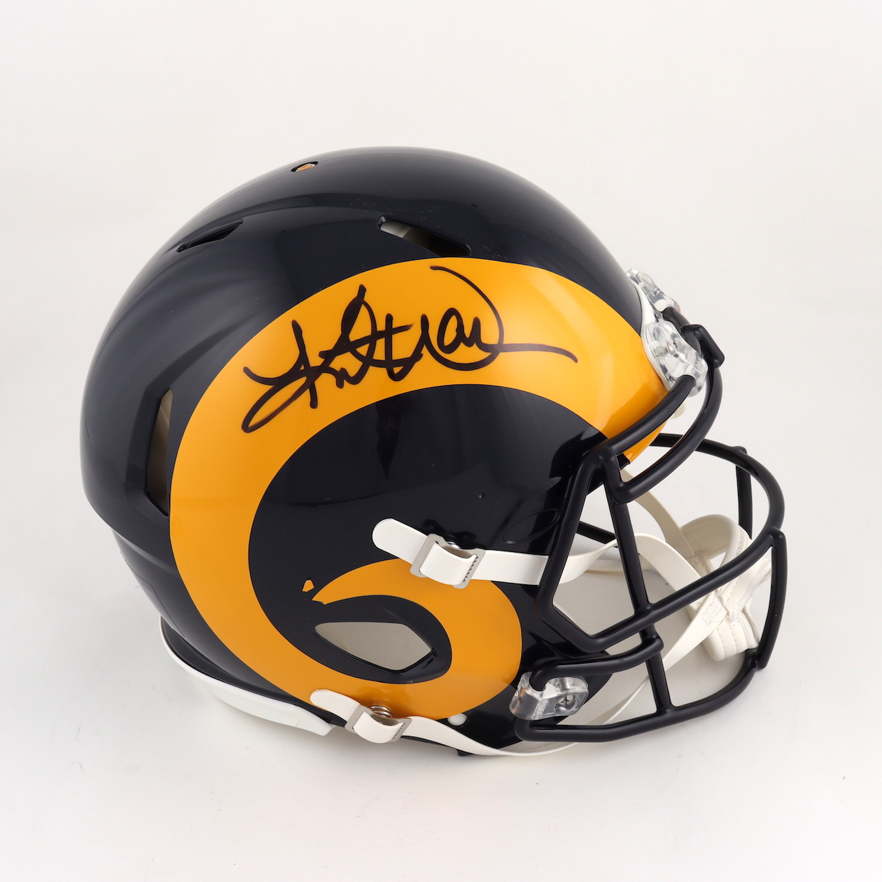 Riddell St. Louis Rams full-size authentic on-field speed helmet. Hand-signed by Kurt Warner (HOF). Please note, part of the decal on the righthand side has torn.
