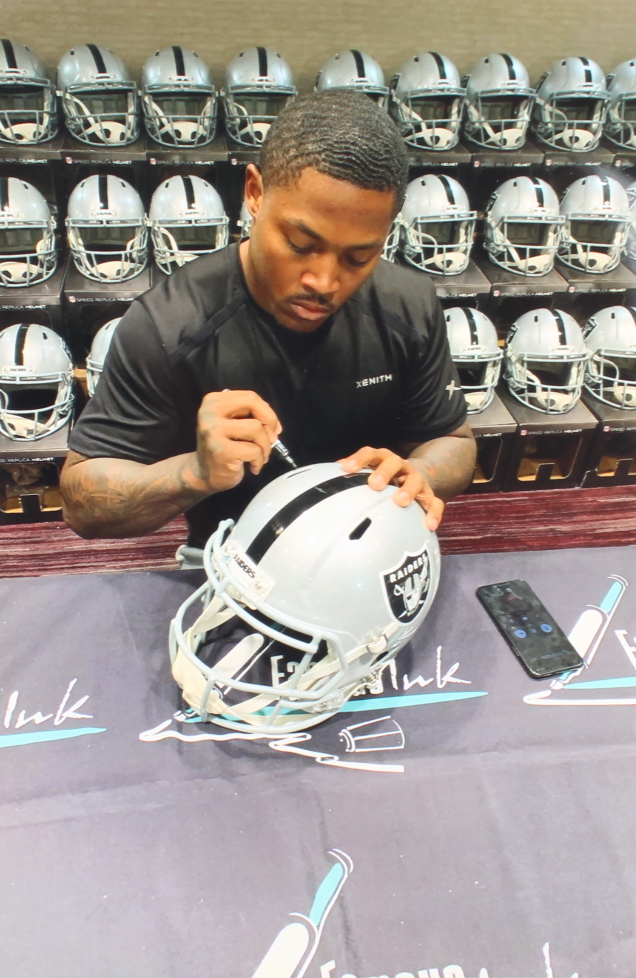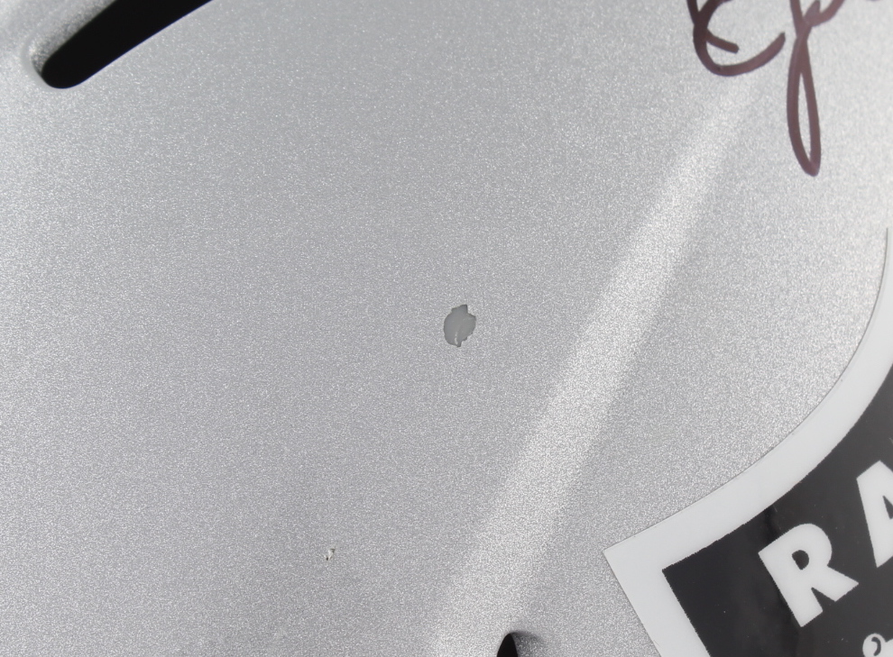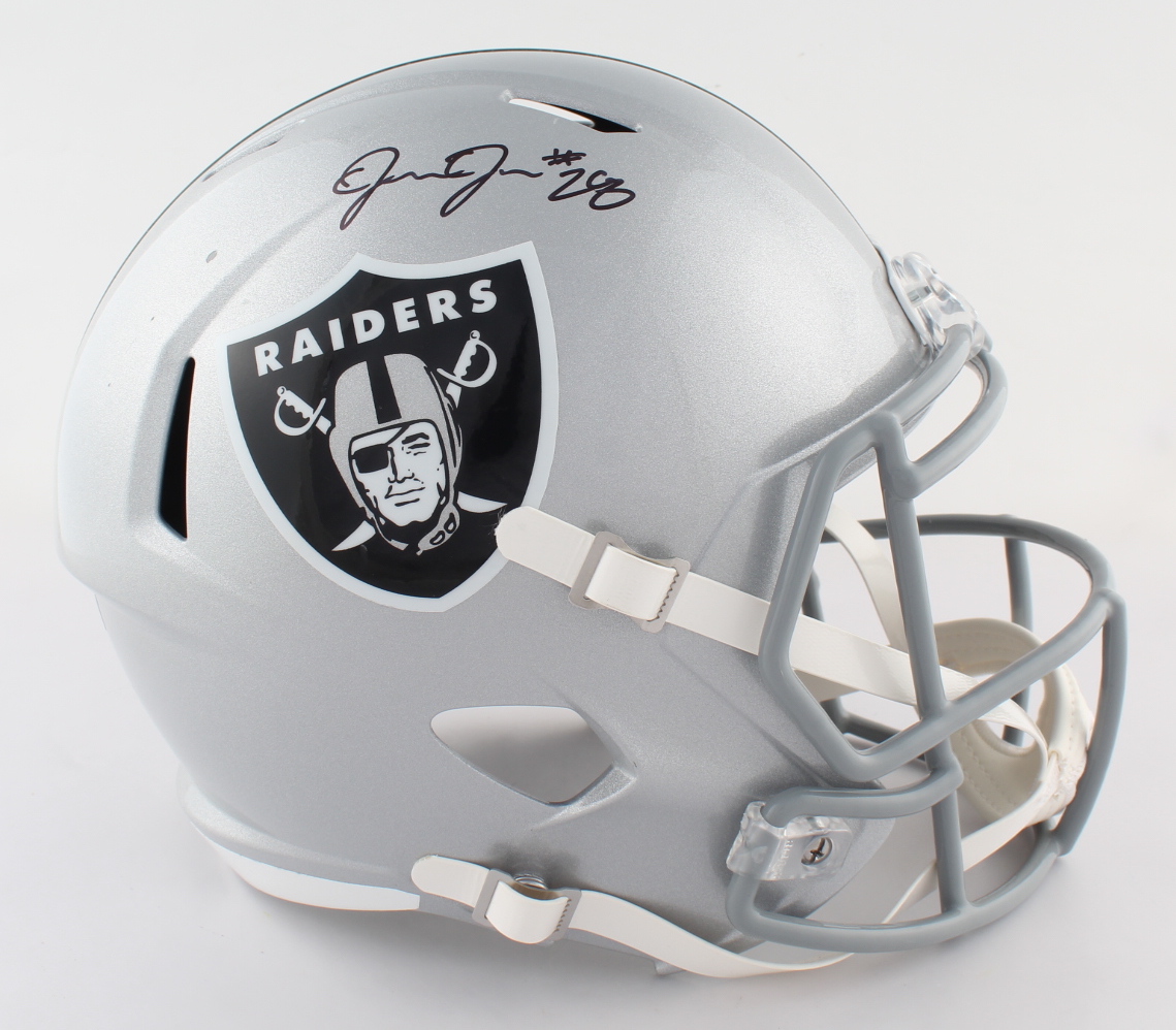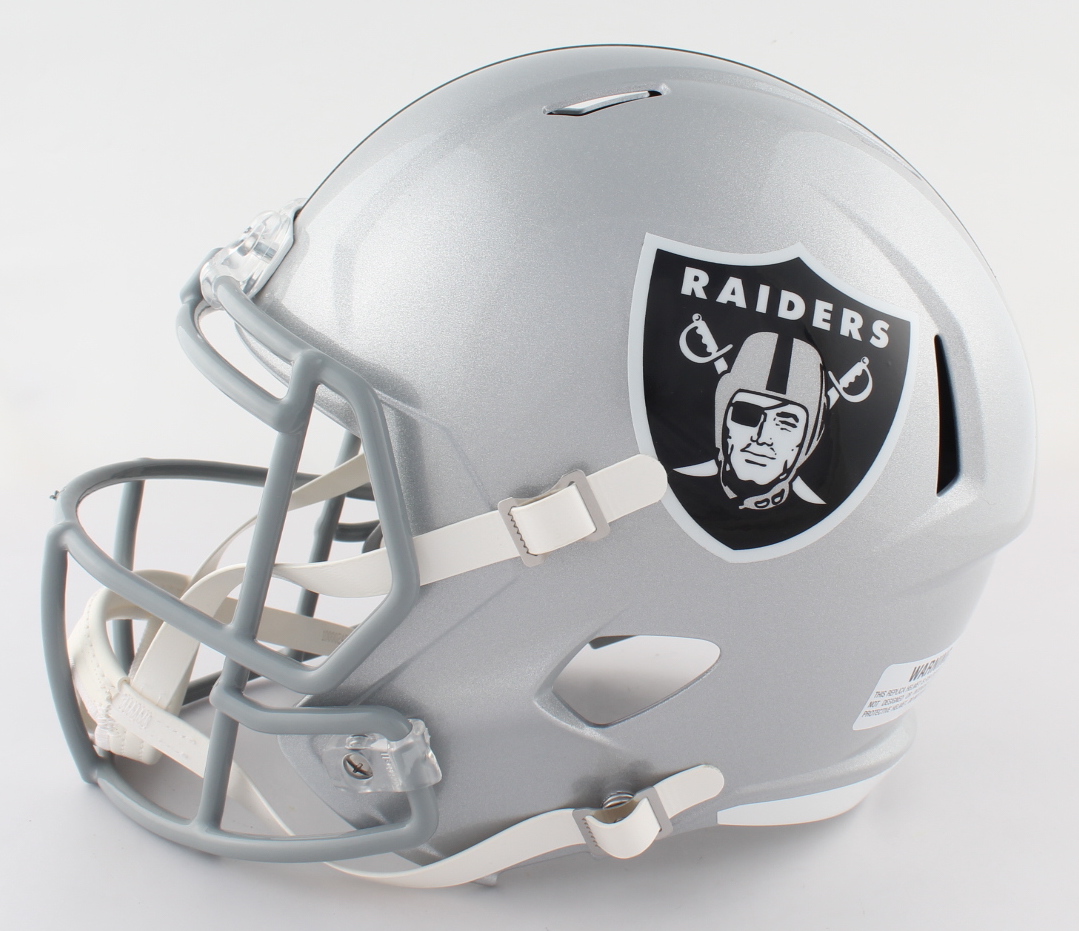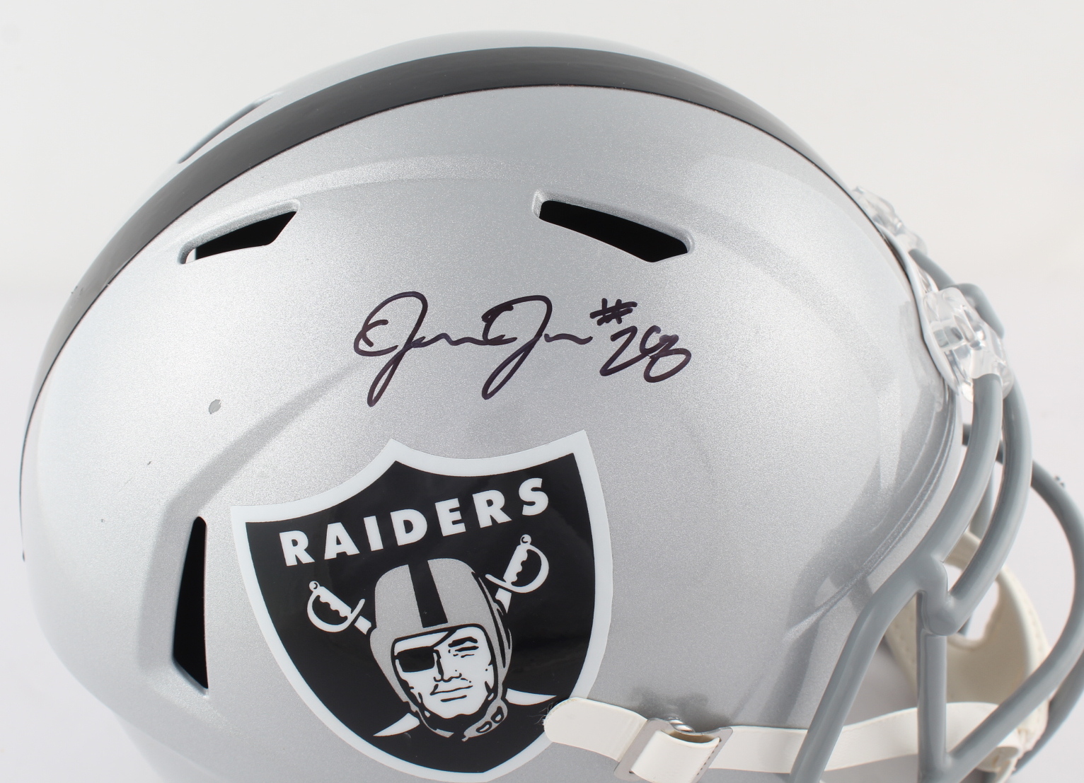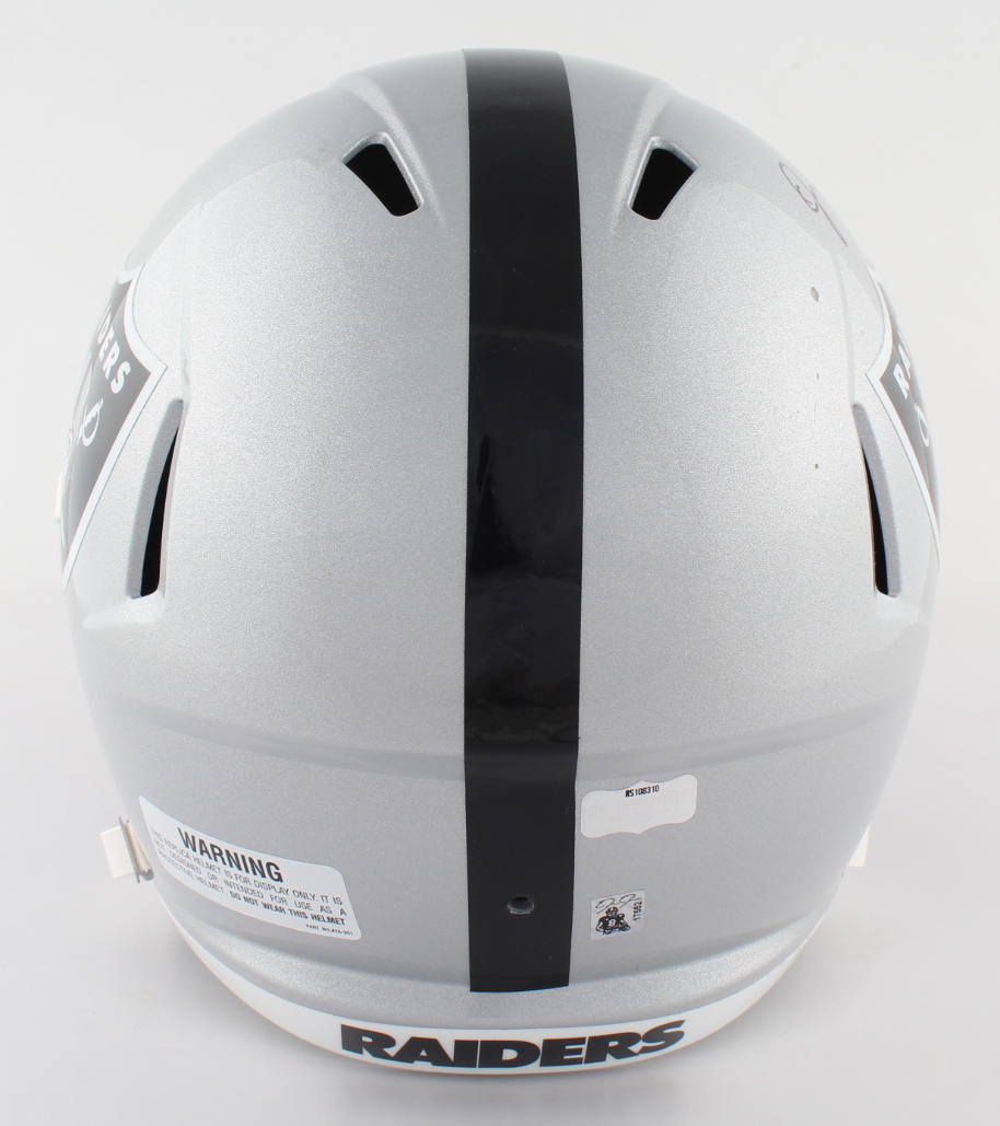 Riddell Las Vegas Raiders full-size replica speed Helmet. Hand-signed by Josh Jacobs. Please note, see images regarding the condition of the paint and face-mask on the helmet.