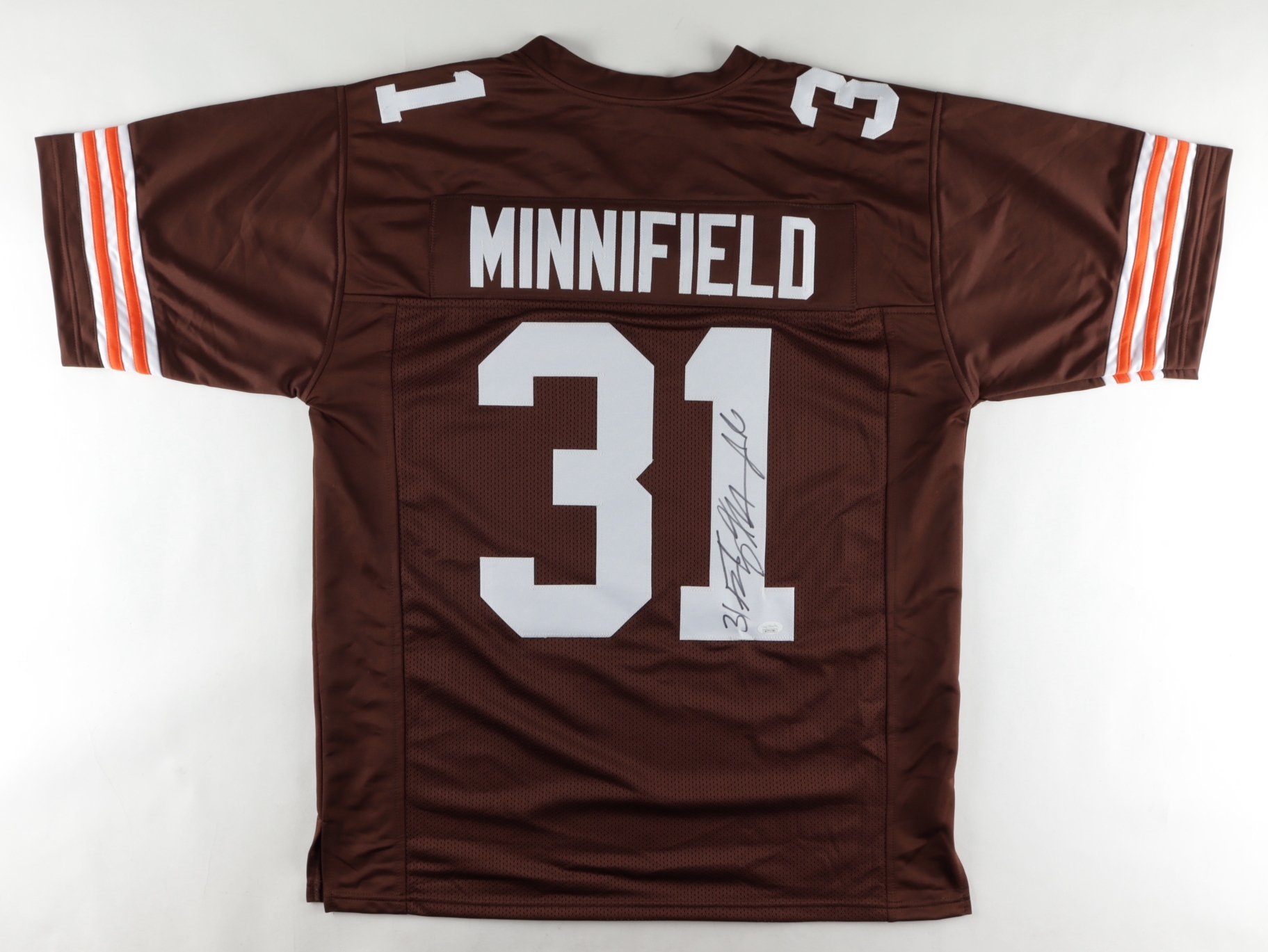 Custom on-field style jersey. Everything is sewn on, size XL. Hand-signed by Frank Minnifield (Cleveland Browns)