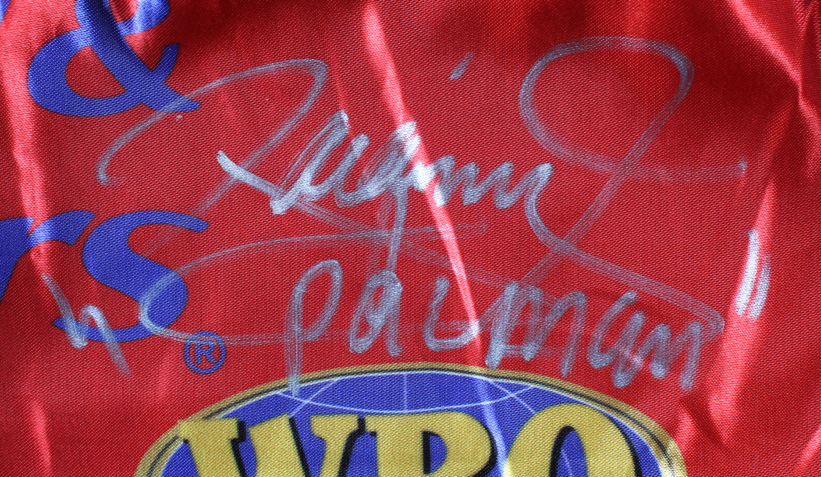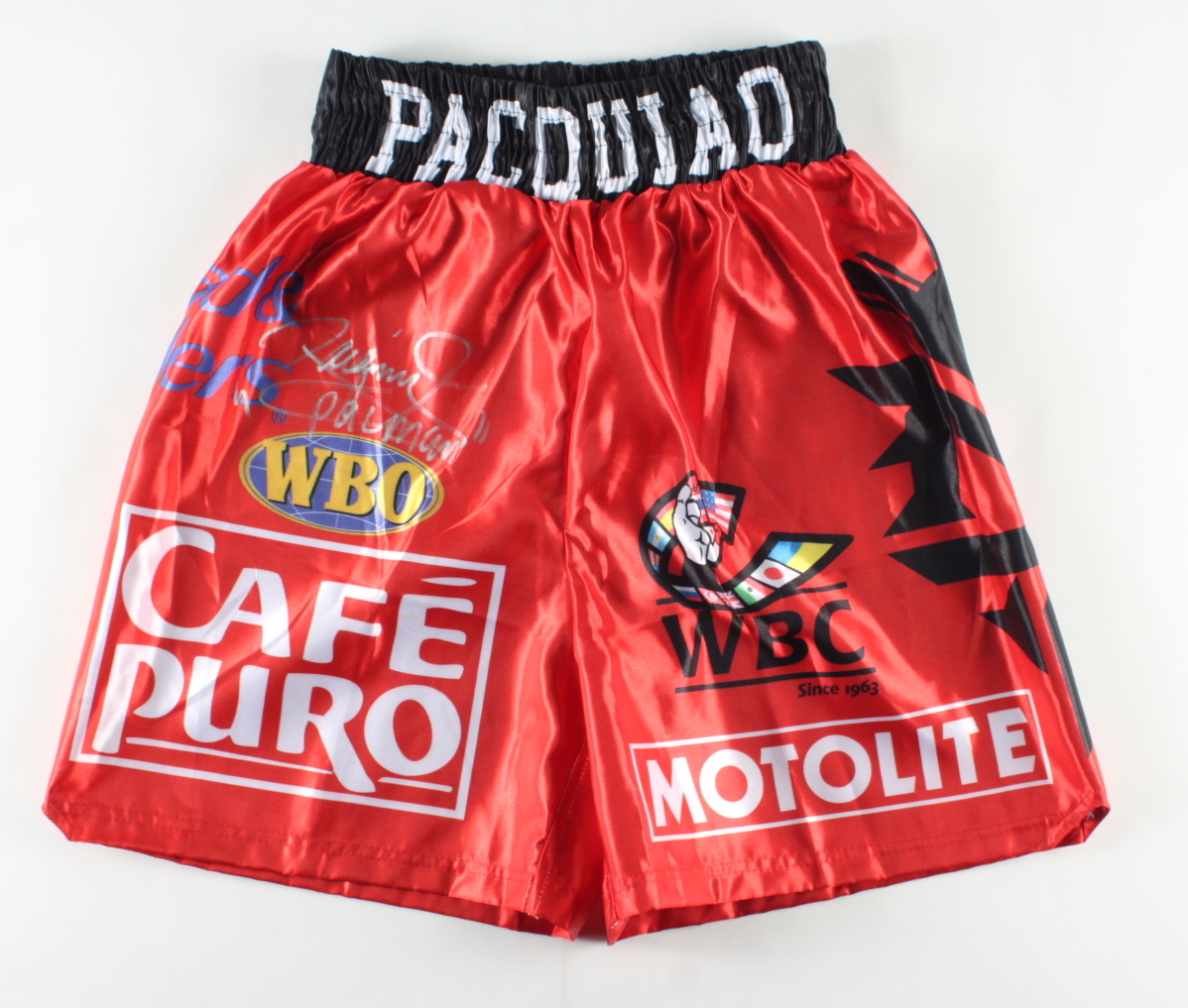 Manny Pacquiao fight model boxing shorts, size M. Hand-signed and inscribed by Manny Pacquiao.