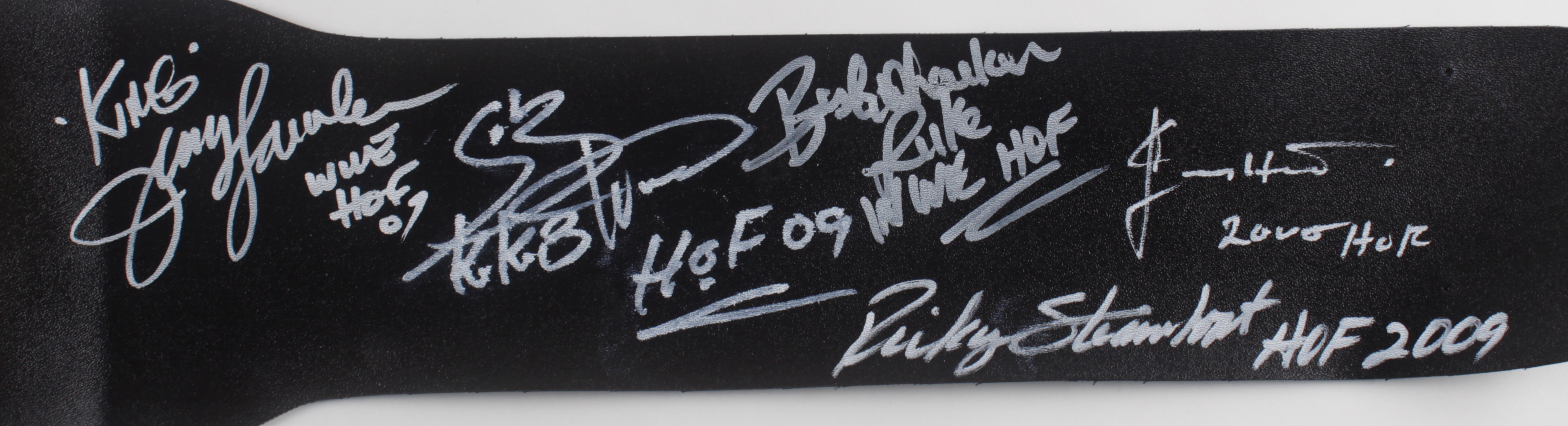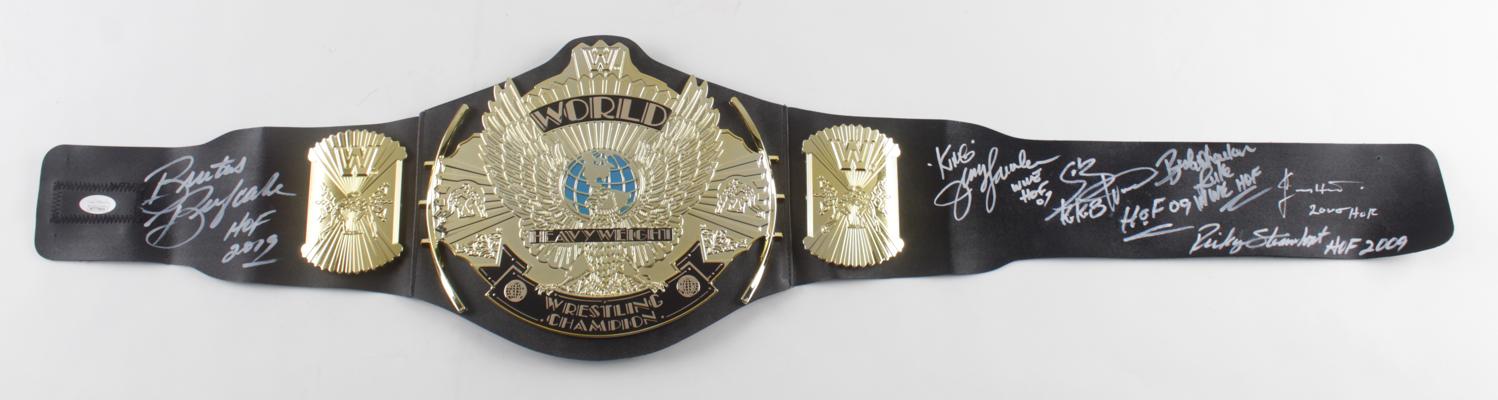 WWE World Heavyweight Champion plastic toy replica belt measures approximately 38" in length and has been hand-signed and inscribed by (6) including Jerry Lawler, Ricky Steamboat, Koko B. Ware, Brutus Beefcake, Luke Williams and Jimmy Hart.