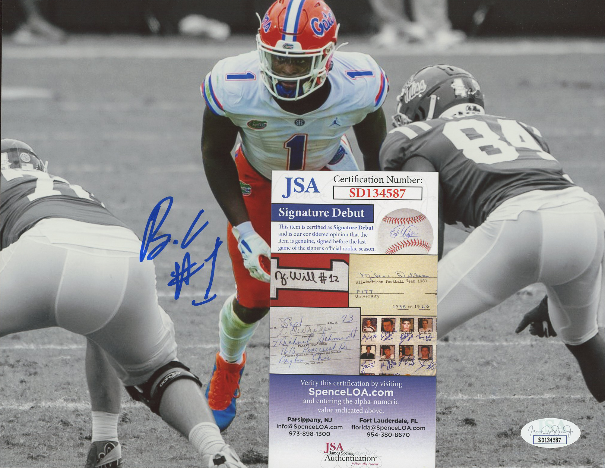 The autograph(s) includes an official James Spence Authentication (JSA) "Signature Debut" hologram and COA. "Signature Debut" is the autographed memorabilia equivalent to a rookie card. The JSA definition of a "Signature Debut" is as follows: "Any item that is autographed and received by JSA prior to the last game of the signer's official rookie season.