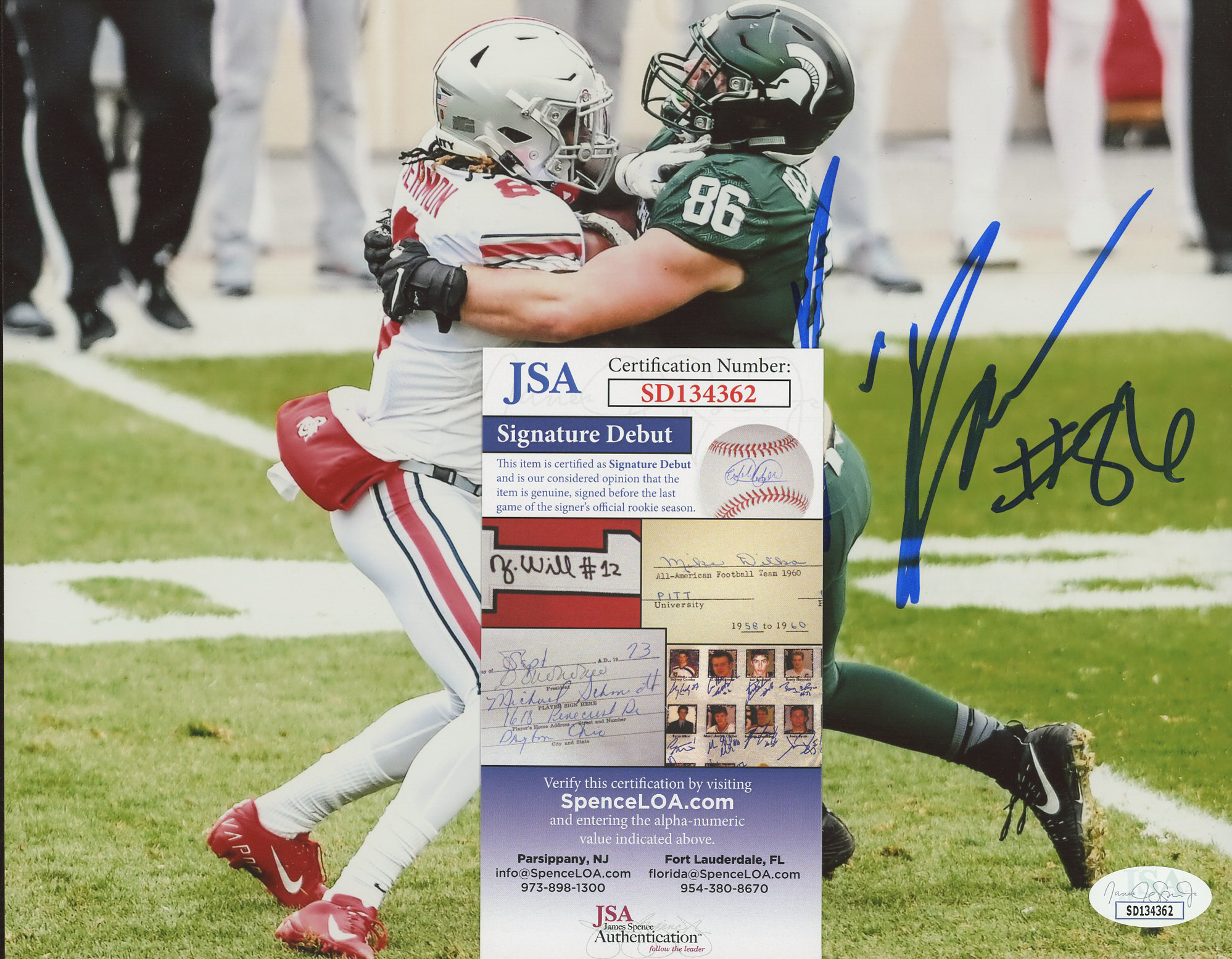 The autograph(s) includes an official James Spence Authentication (JSA) "Signature Debut" hologram and COA. "Signature Debut" is the autographed memorabilia equivalent to a rookie card. The JSA definition of a "Signature Debut" is as follows: "Any item that is autographed and received by JSA prior to the last game of the signer's official rookie season.
