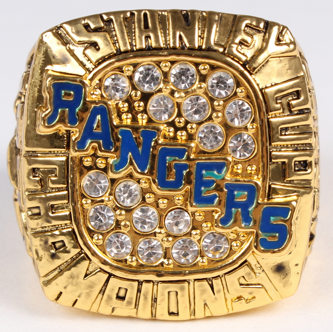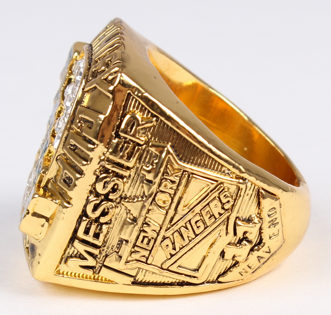 Mark Messier New York Rangers High Quality Replica 1994 Stanley Cup Champions Ring. The ring has been hand crafted by professional jewelers. Made of metal alloy and clad with 18K gold. Size 12.