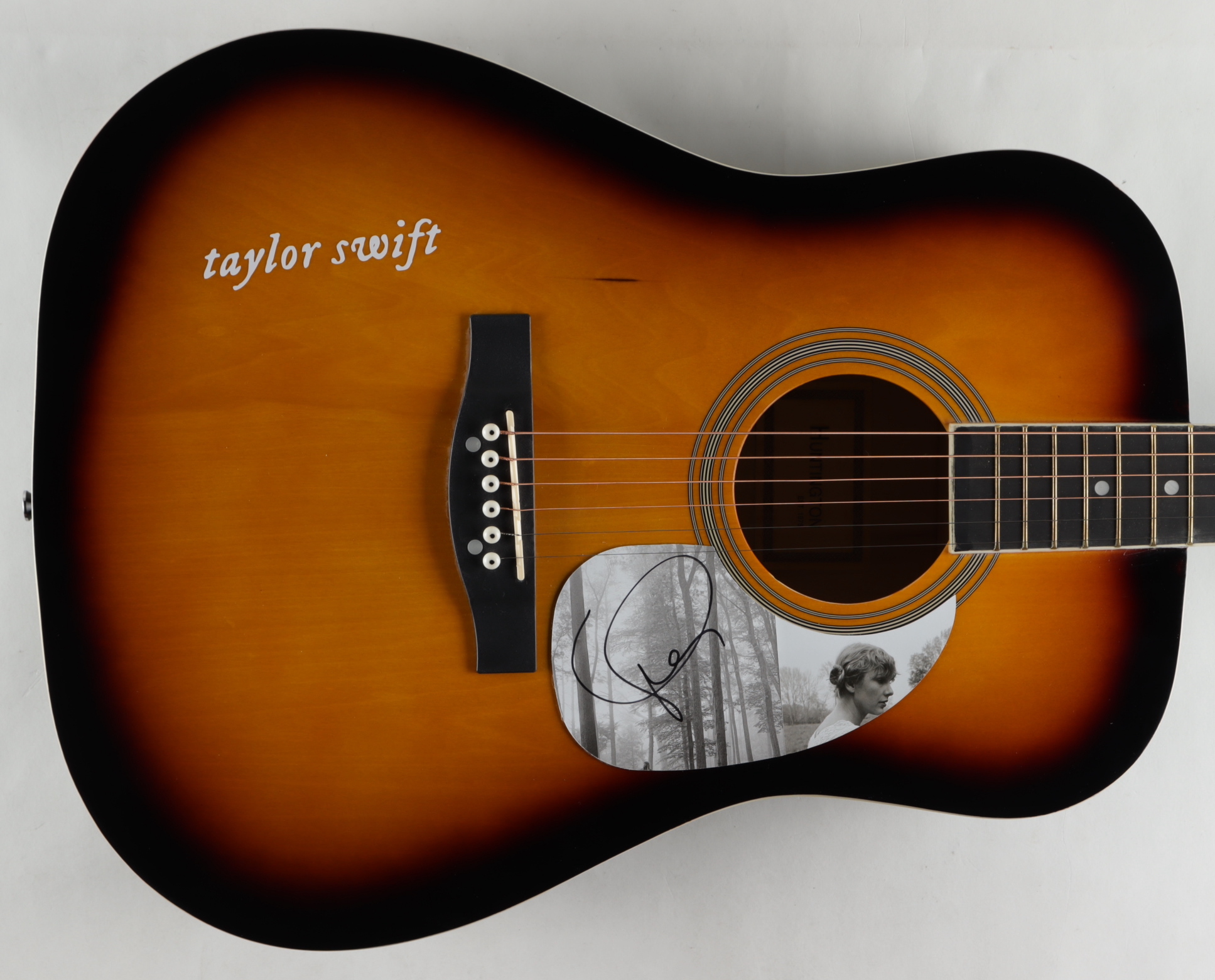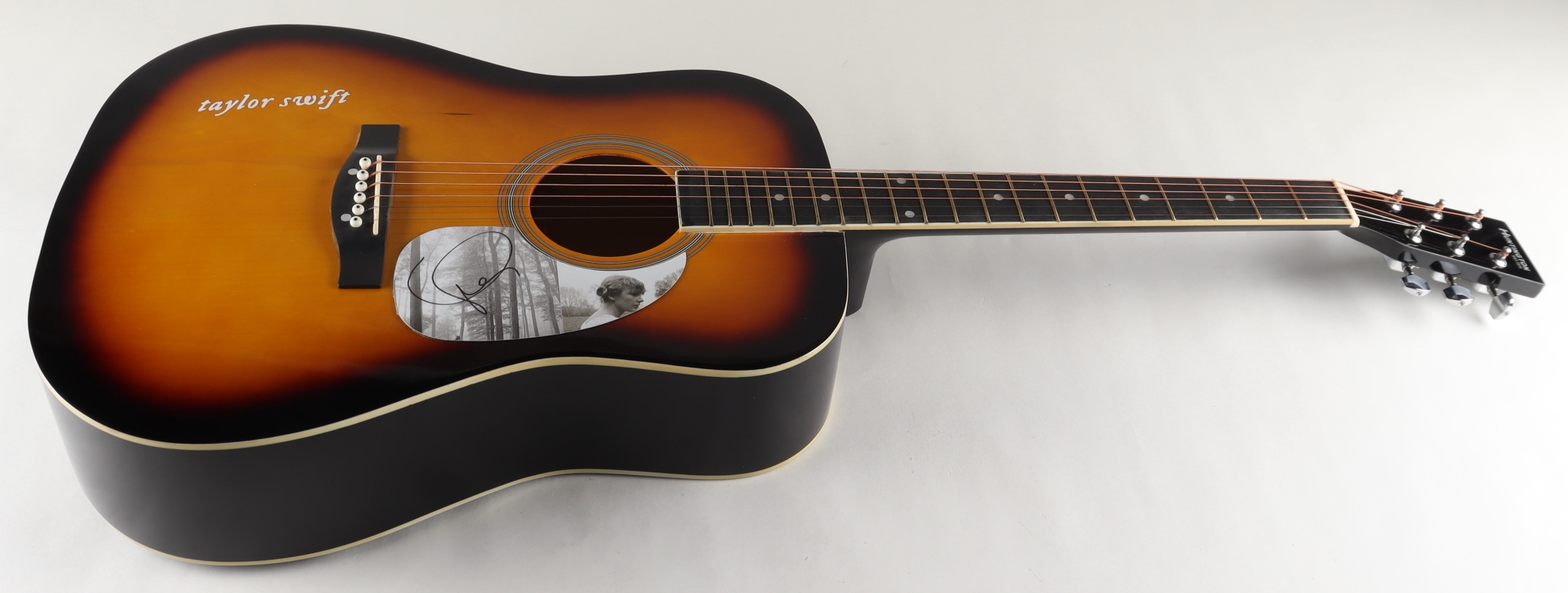 Acoustic guitar measures approximately 41” in size and has been hand-signed on the CD cover, re-purposed as a pickguard, by Taylor Swift.