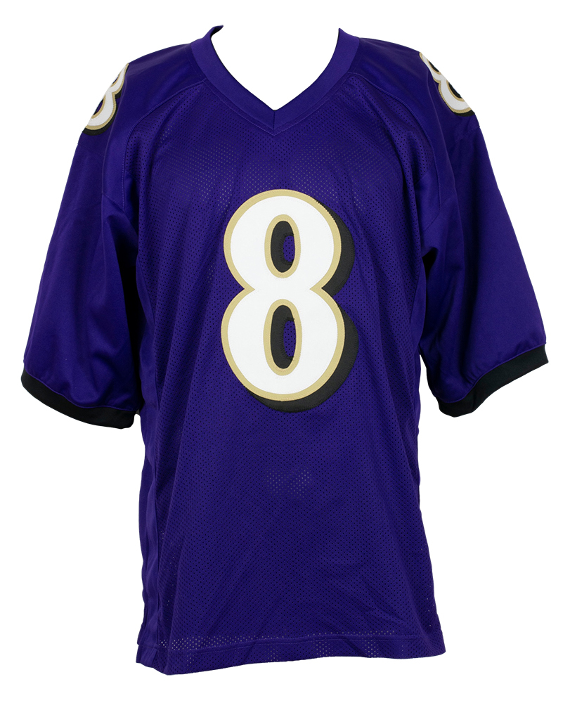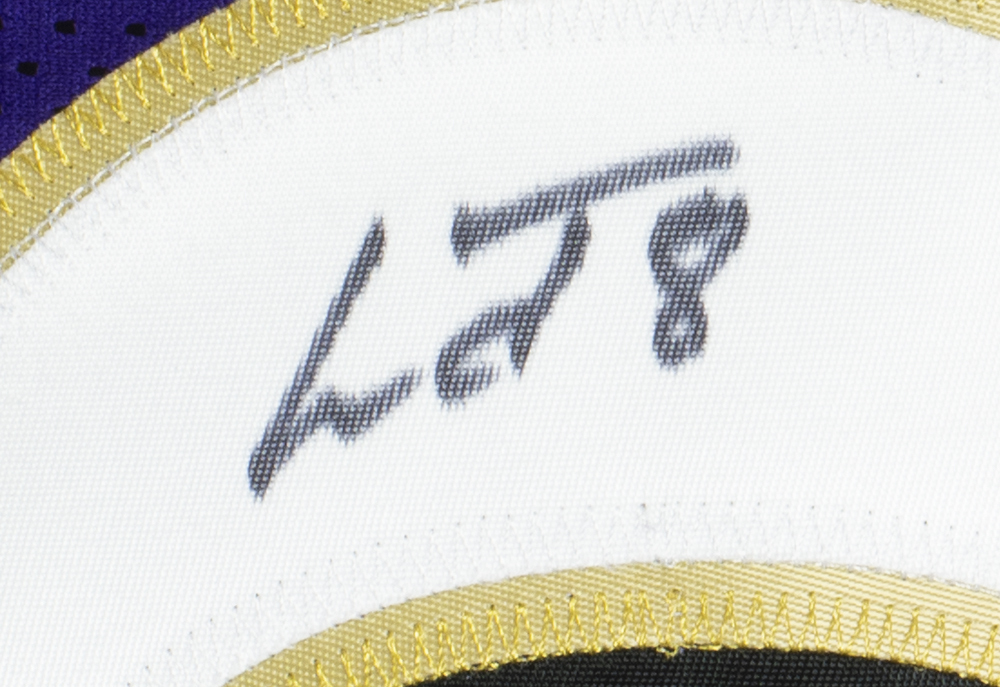Custom on-field style jersey. Everything sewn on, size XL. Hand-signed by Lamar Jackson.