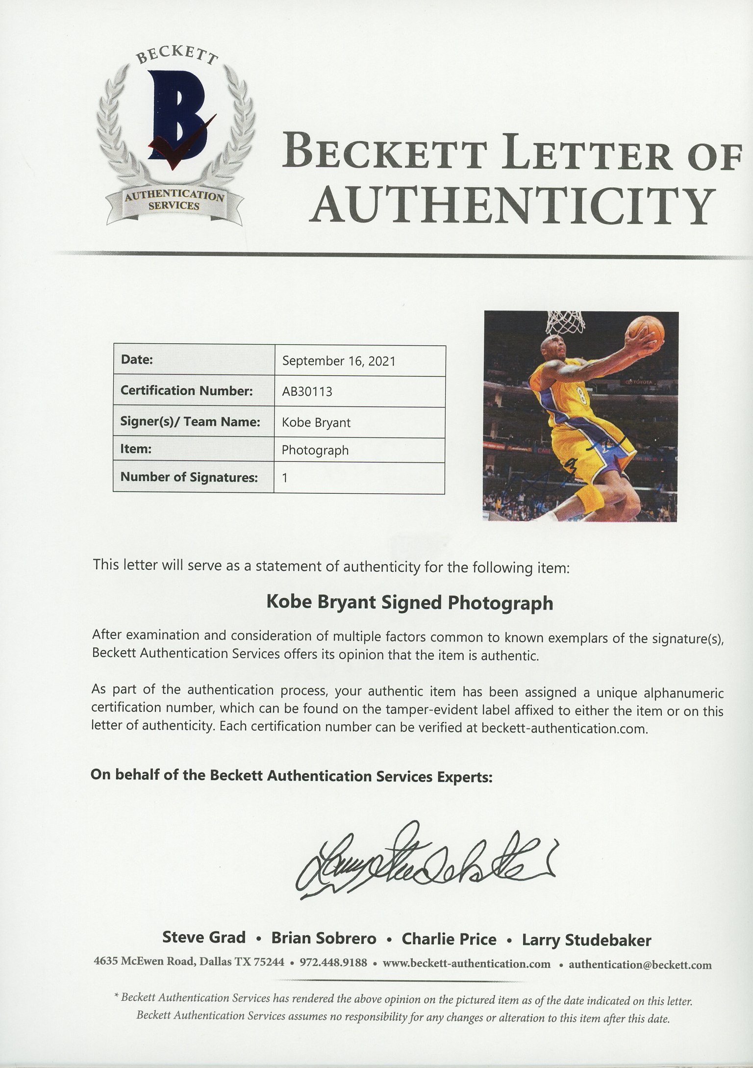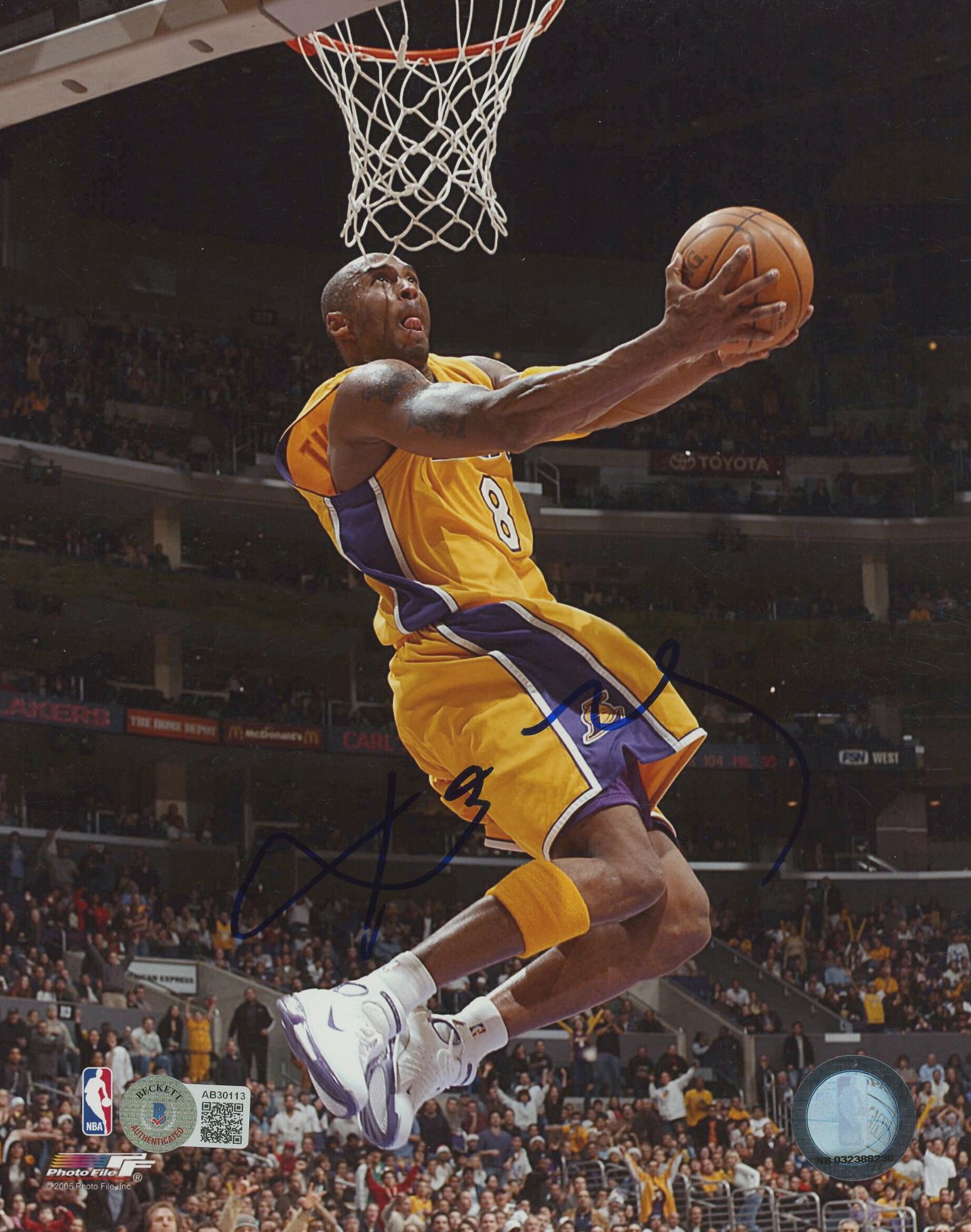 Photo measures 8" x 10" in size and has been hand-signed by Kobe Bryant (D. 2020, Los Angeles Lakers, HOF).